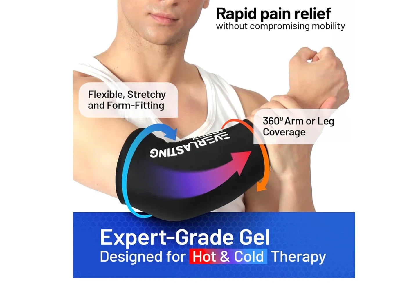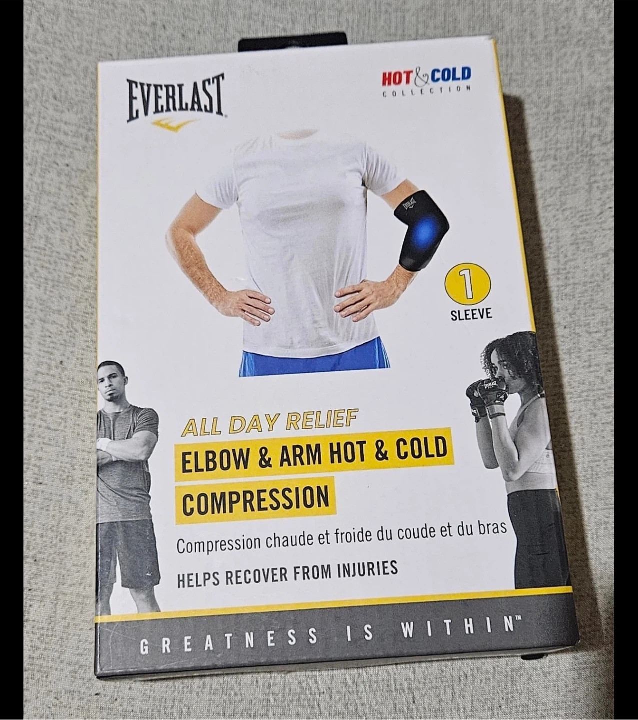 This Everlast sleeve provides all-day relief for your elbow and arm. It's designed for hot and cold therapy to help you recover from injuries. The compression sleeve is flexible, stretchy, and form-fitting for 360-degree coverage. This is great for those needing support during physical activity or recovery!