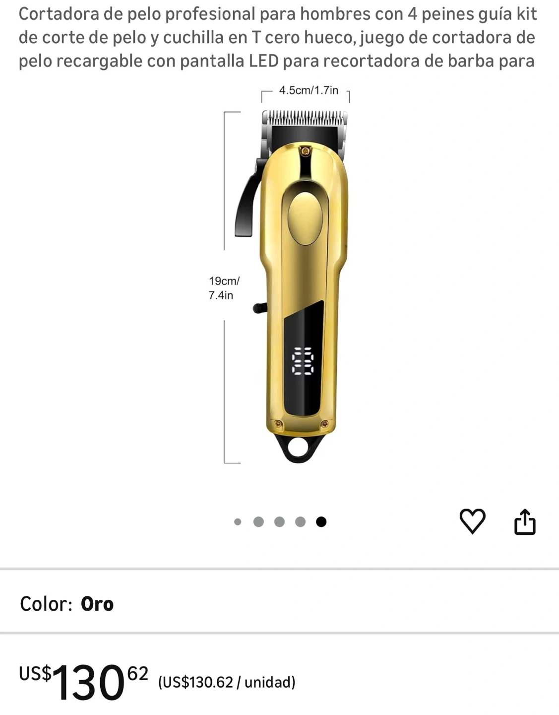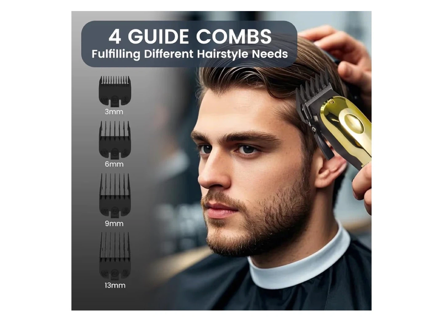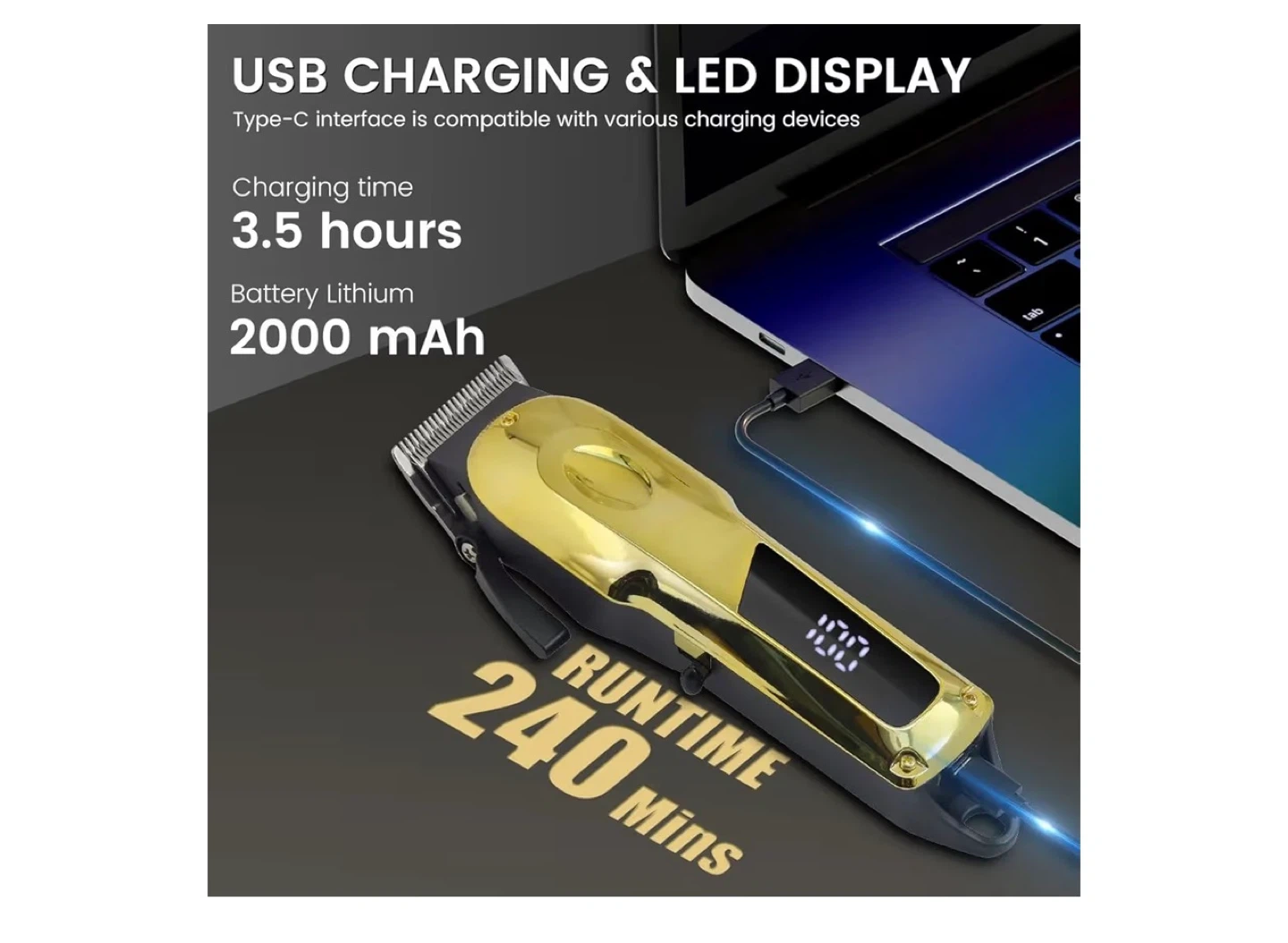 This is a Daling Professional Cordless Hair Clipper. It features a fine steel cutter head and an adjustable blade. It has a rechargeable battery with an LCD screen displaying power left. Charging time is 3.5 hours and runtime is 240 minutes.