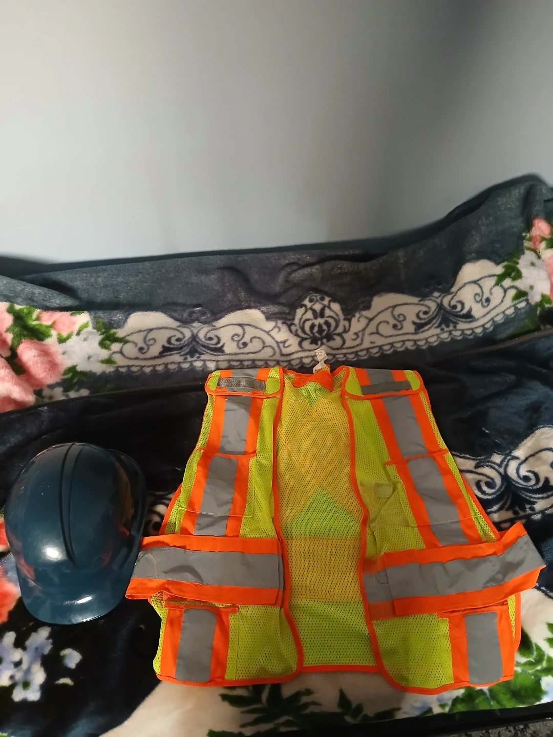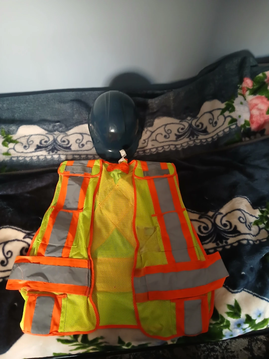 Safety Vest: High-visibility lime/orange with reflective striping. Includes multiple front pockets and a radio/mic clip.