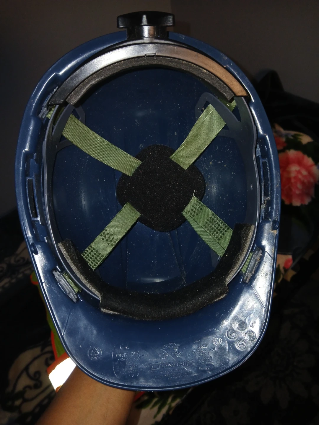 Hard Hat: Dynamic brand, Navy Blue. Features a ratchet suspension (the knob on the back) for an easy, adjustable fit. CSA Z94.1 approved.