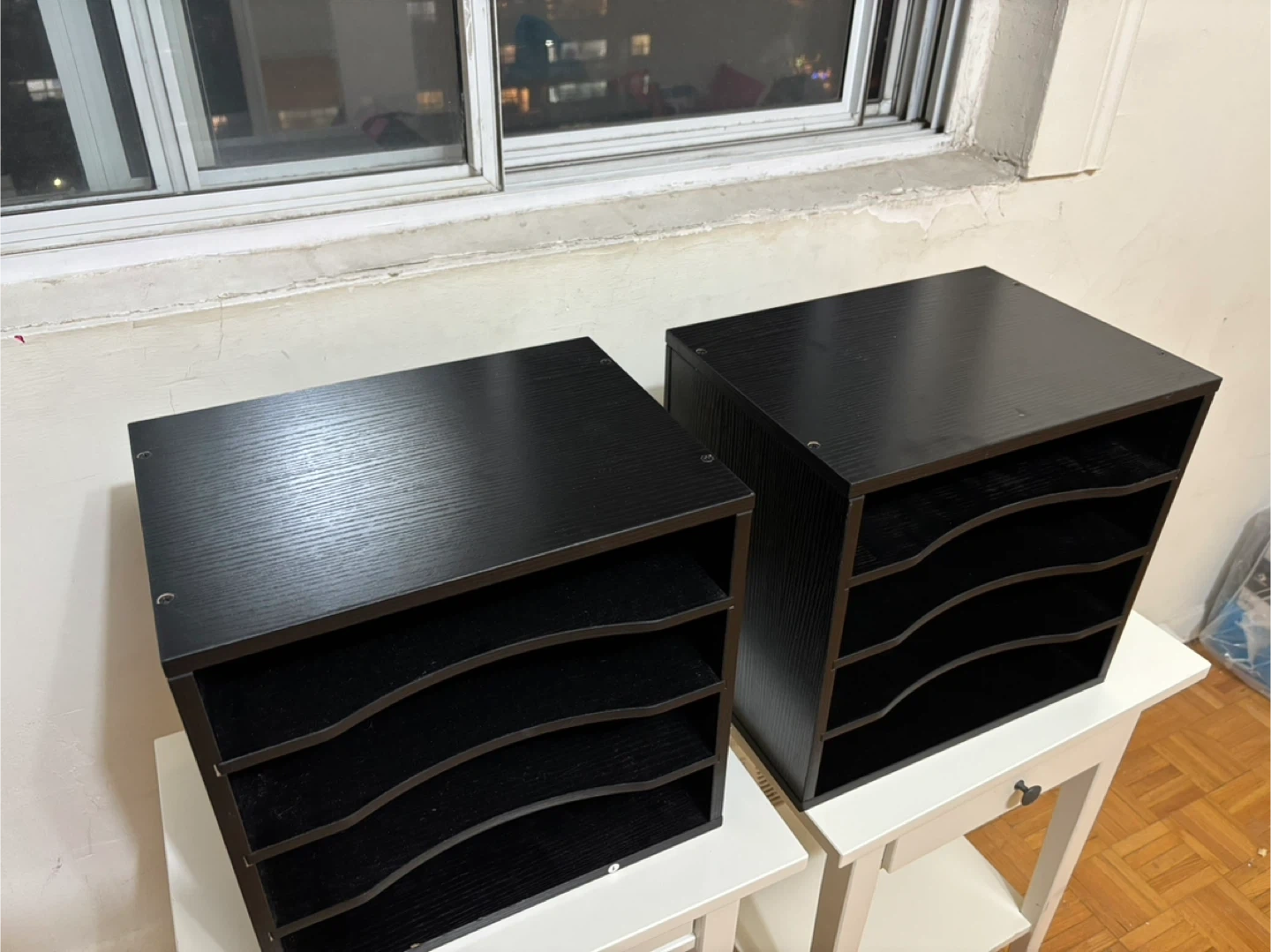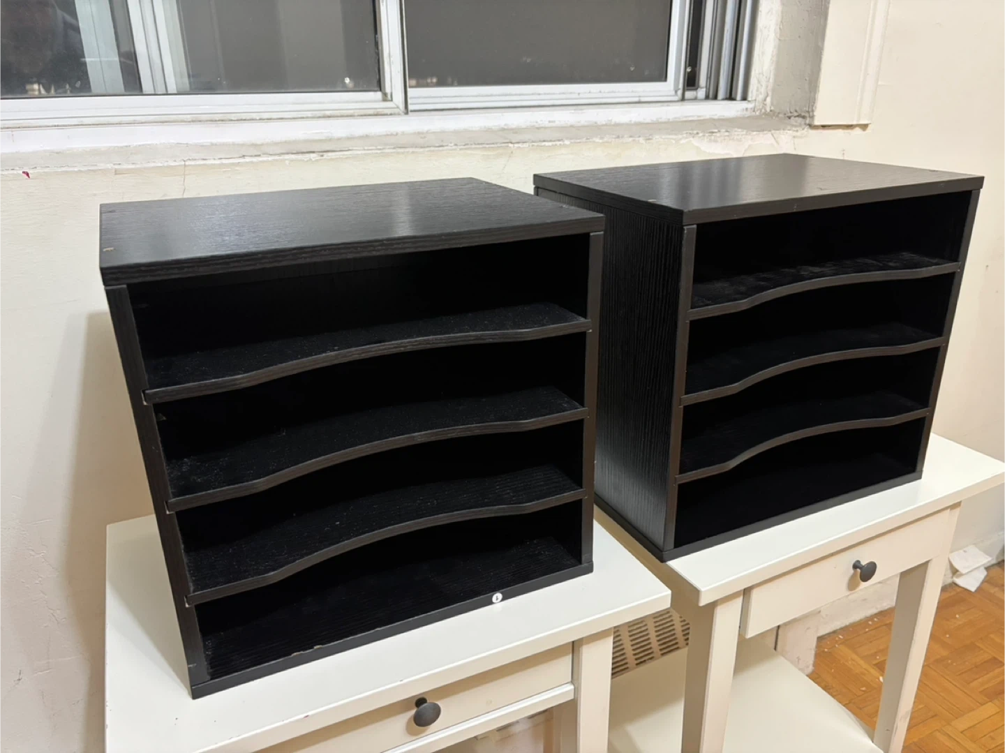 Selling a set of two black wooden file organizers! They're perfect for keeping your desk or office space tidy and organized. These organizers are in great condition and ready to use