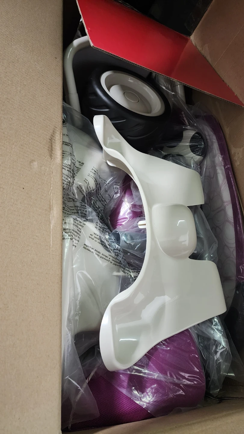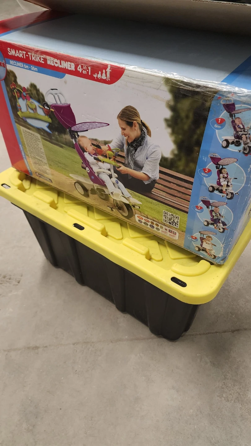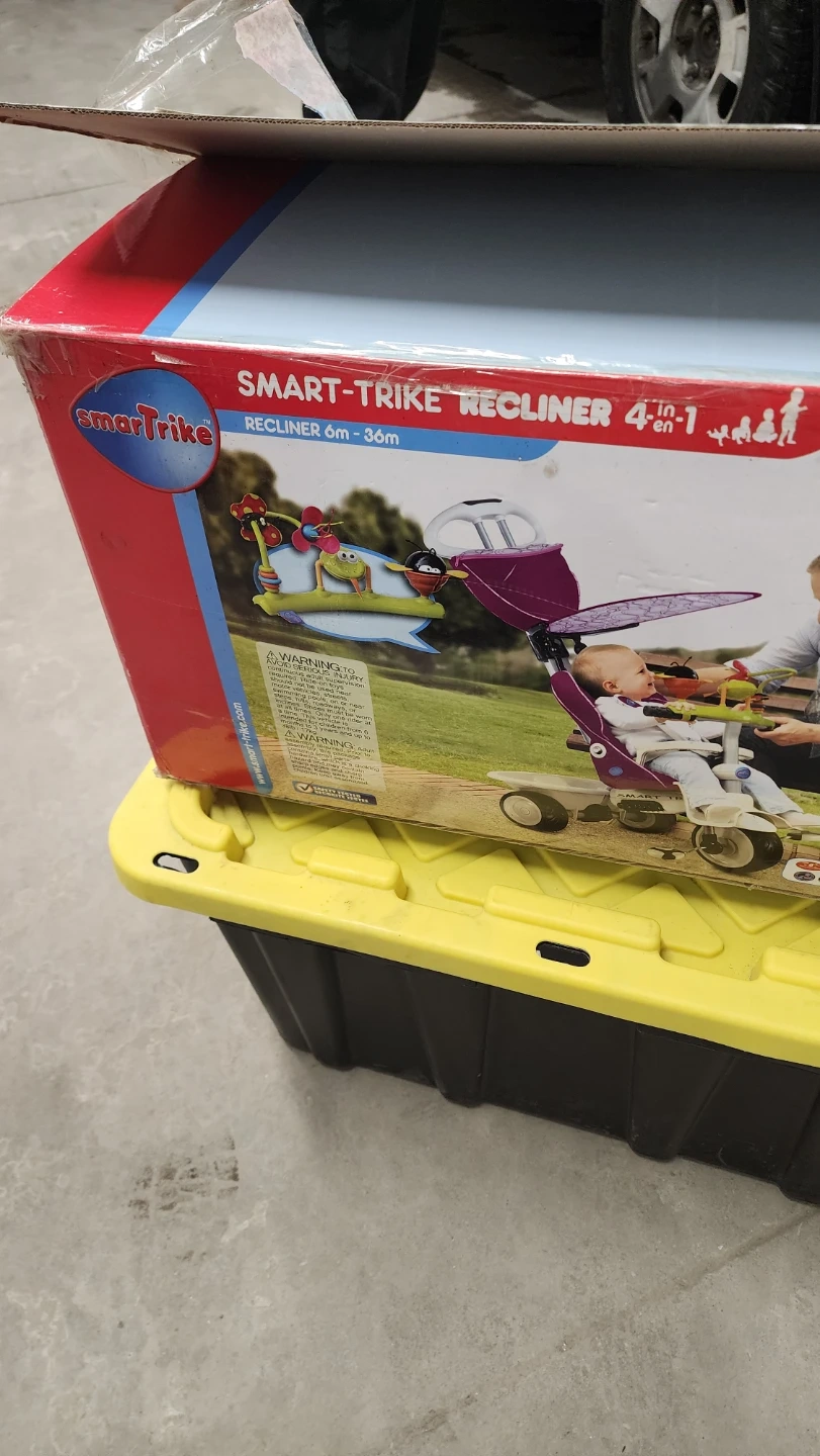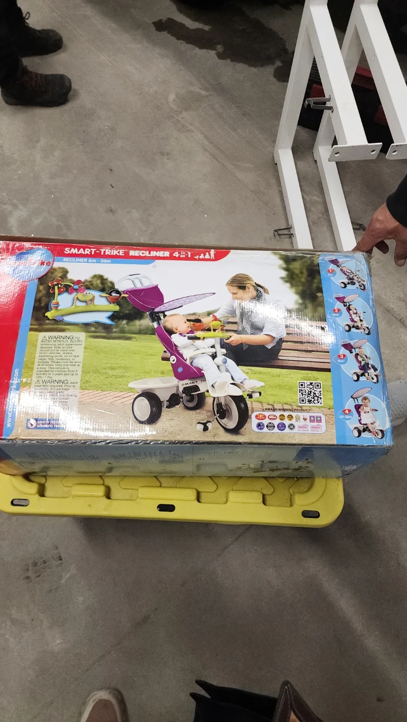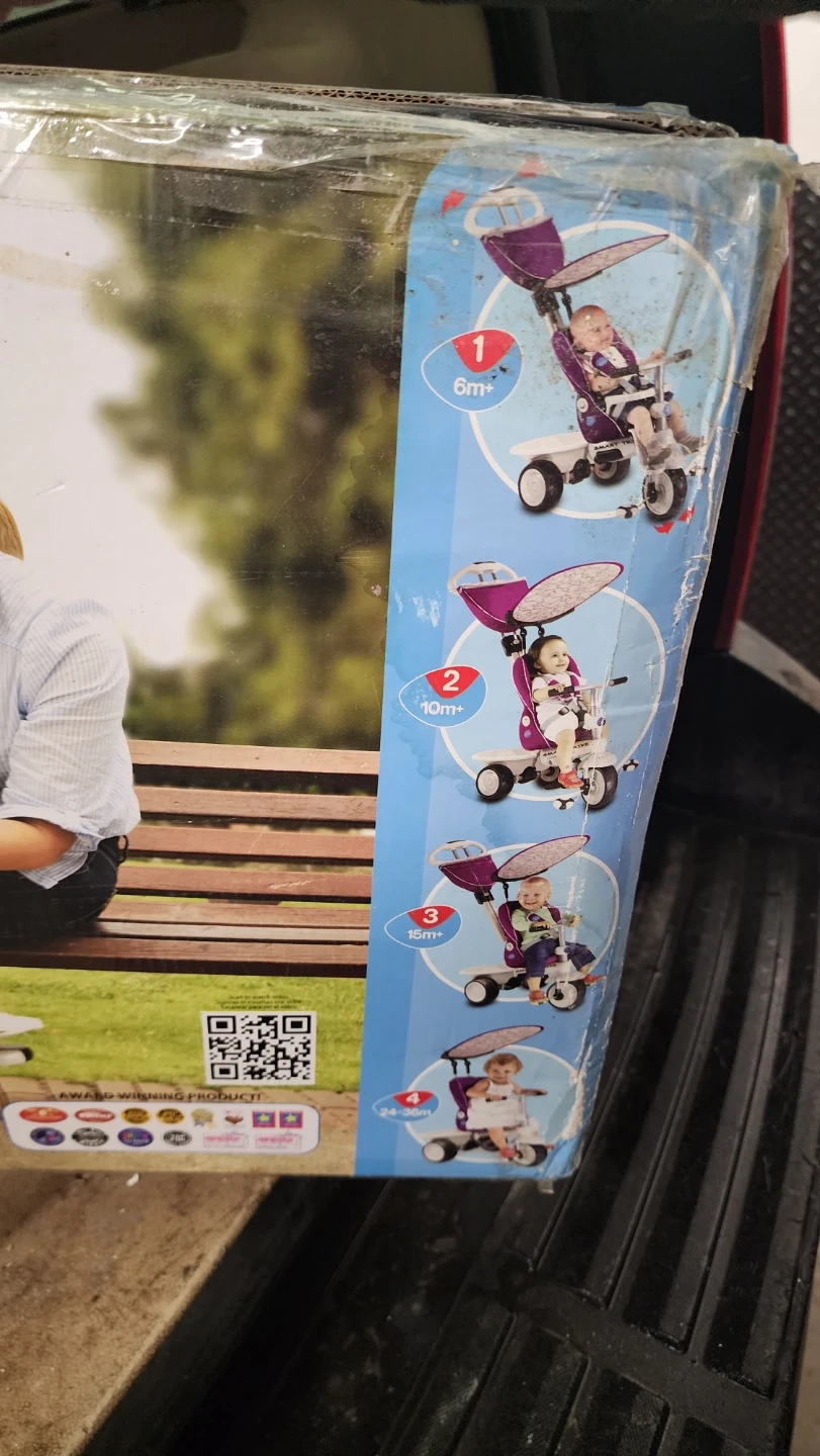 This Smart-Trike Recliner 4-in-1 is designed for babies aged 6 months to 36 months. It converts to multiple stages to grow with your child. The box is included and shows the tricycle in purple.