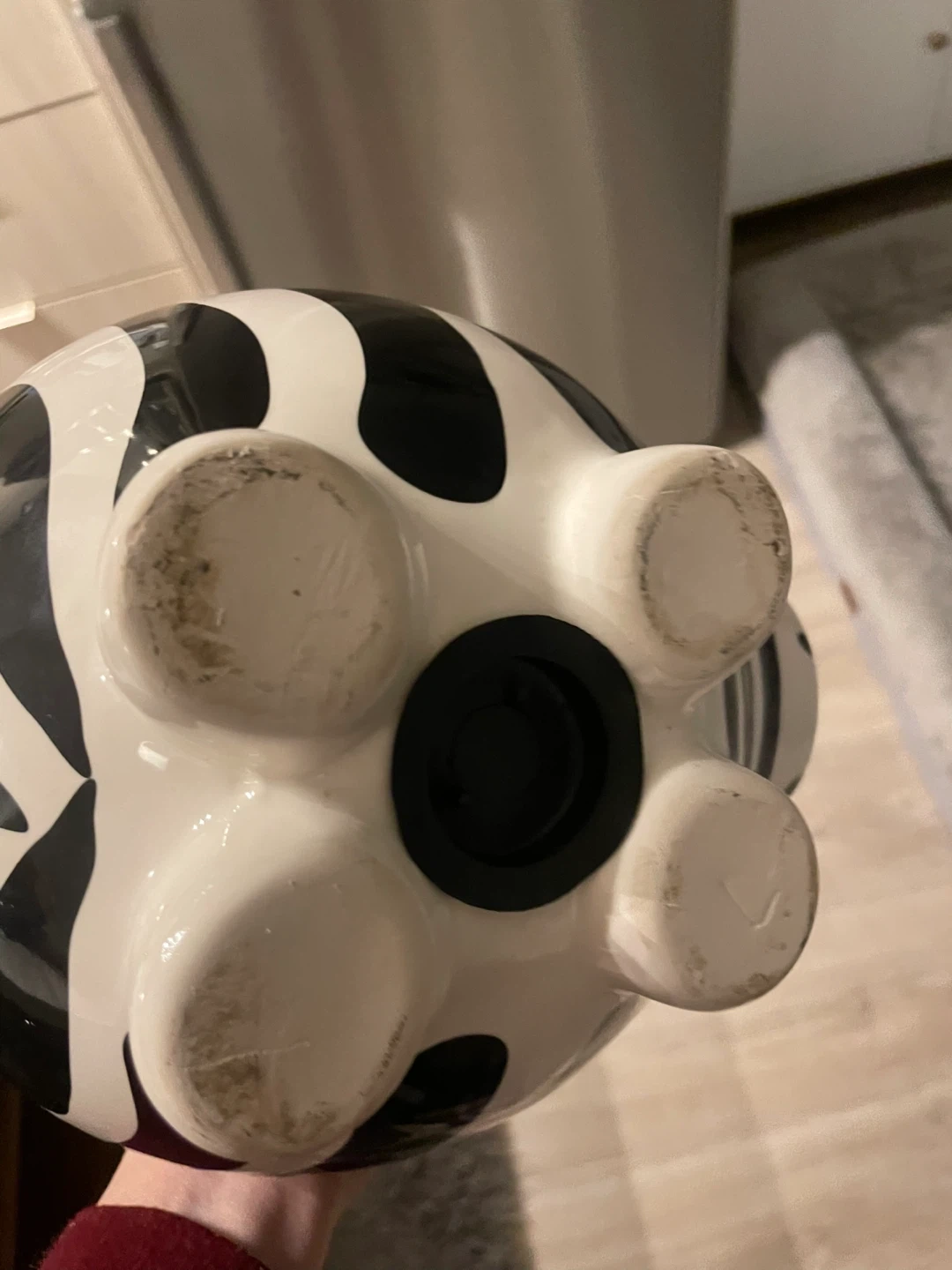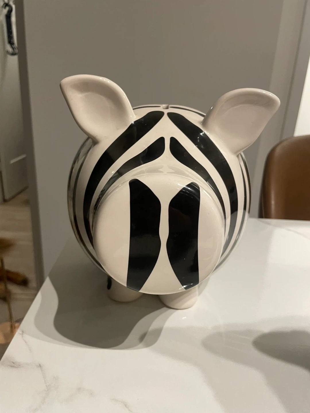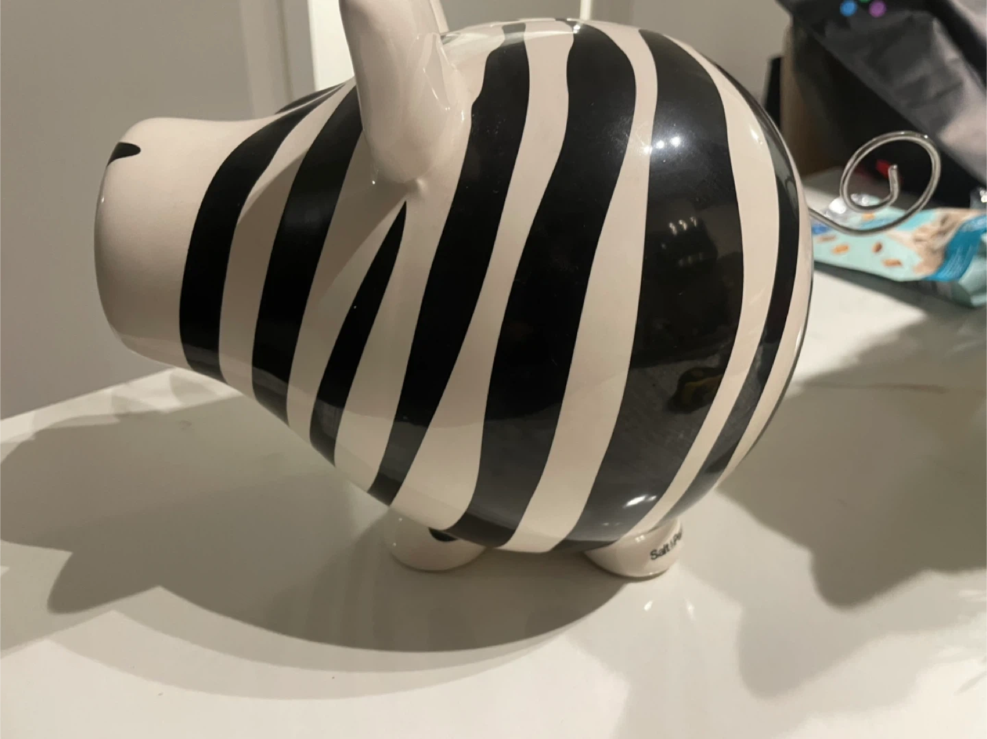 This cute zebra-striped piggy bank is made of ceramic. It has a coin slot on top and a stopper on the bottom.