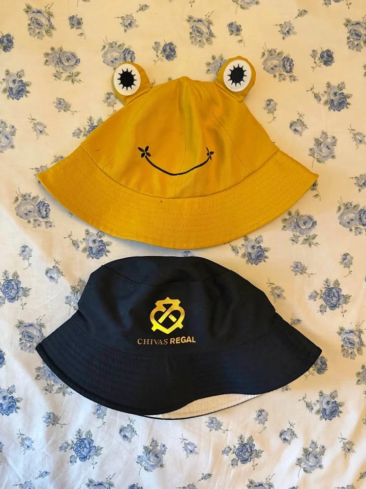 Set of 2 bucket hats: one frog print and one black Chivas Regal. Pickup downtown at Yonge and Wellesley.