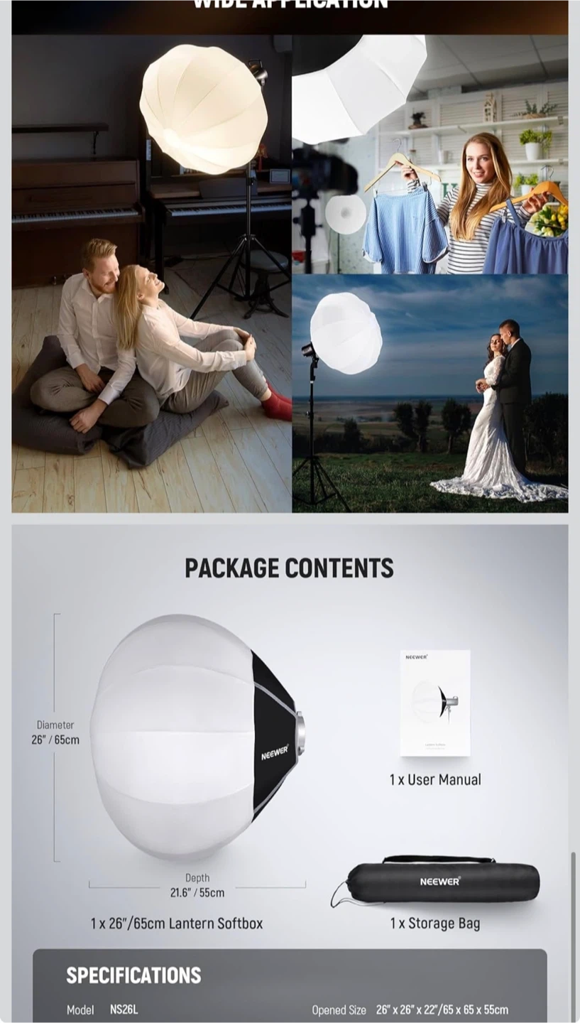 • Key Features: Bowens mount, 360-degree soft light spread. The quick-release design makes setup/teardown take seconds.