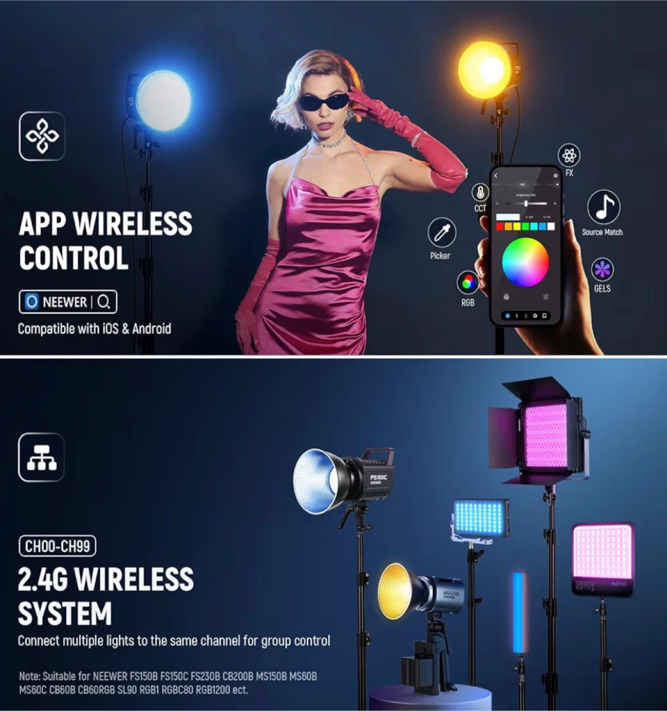 • Key Features: Full RGB color control (not just bi-color!), 17 special effects, 2.4G/App control, and 19800 lux @ 1m. Heavy-duty COB output with CRI97+.