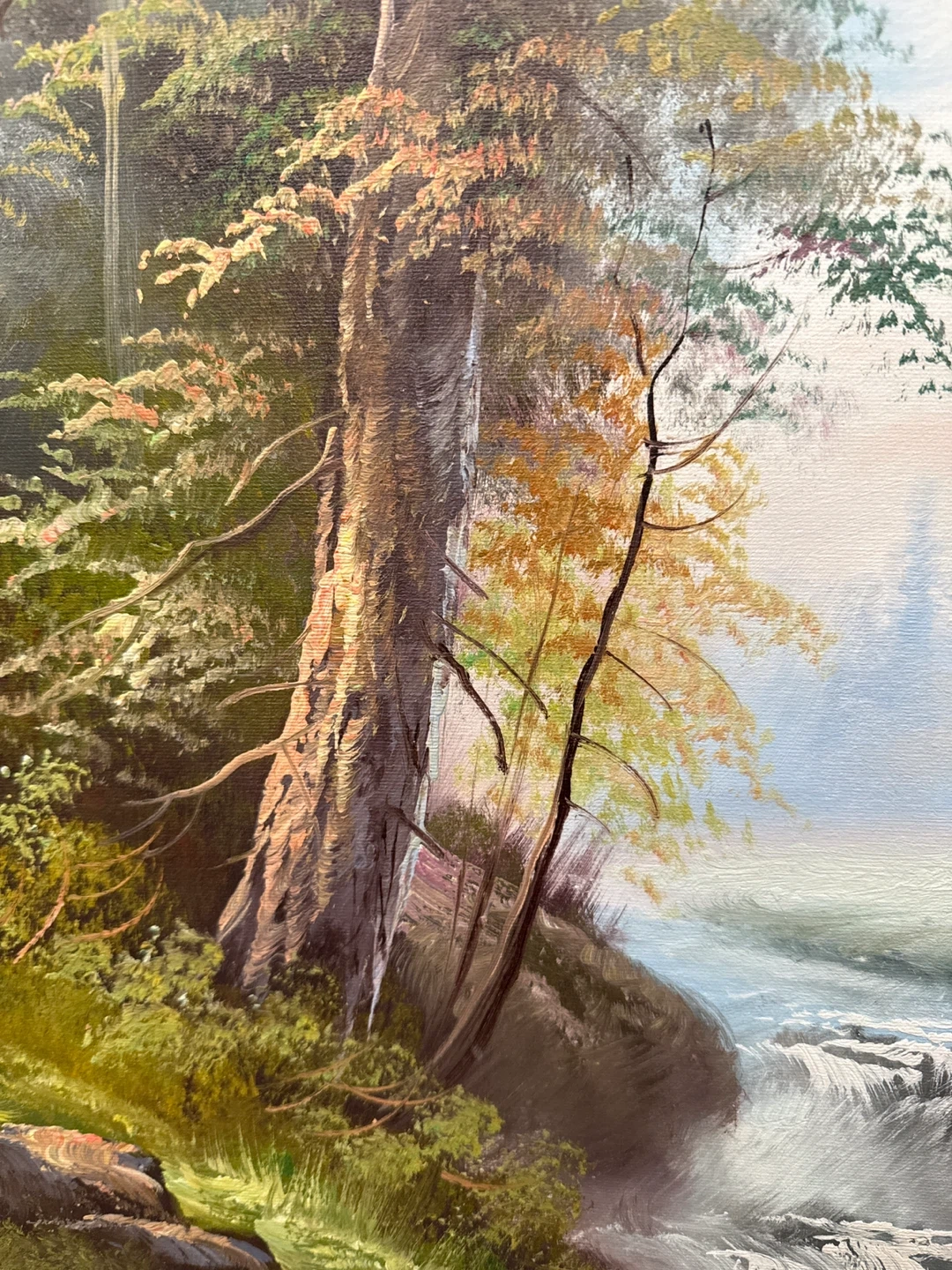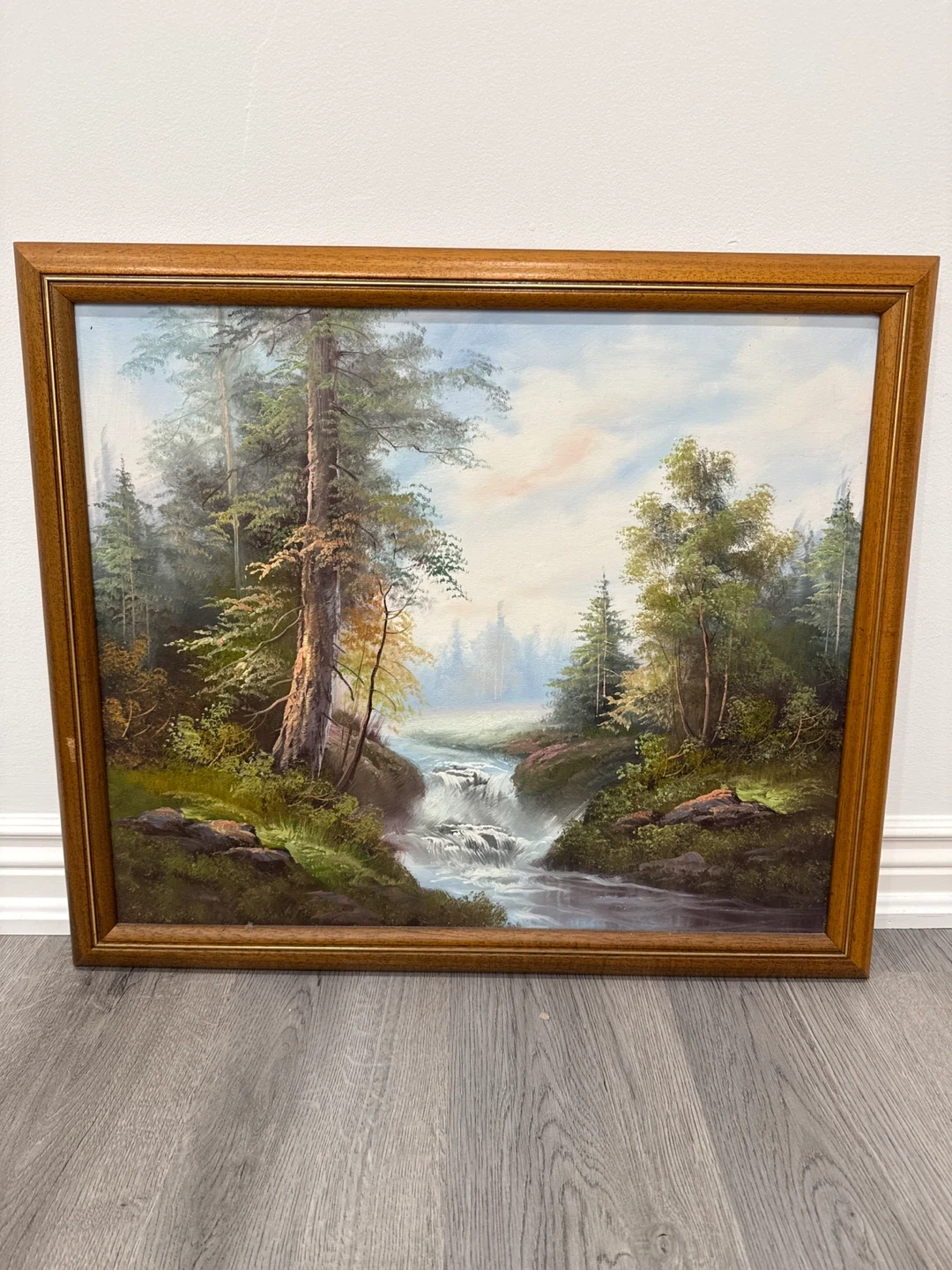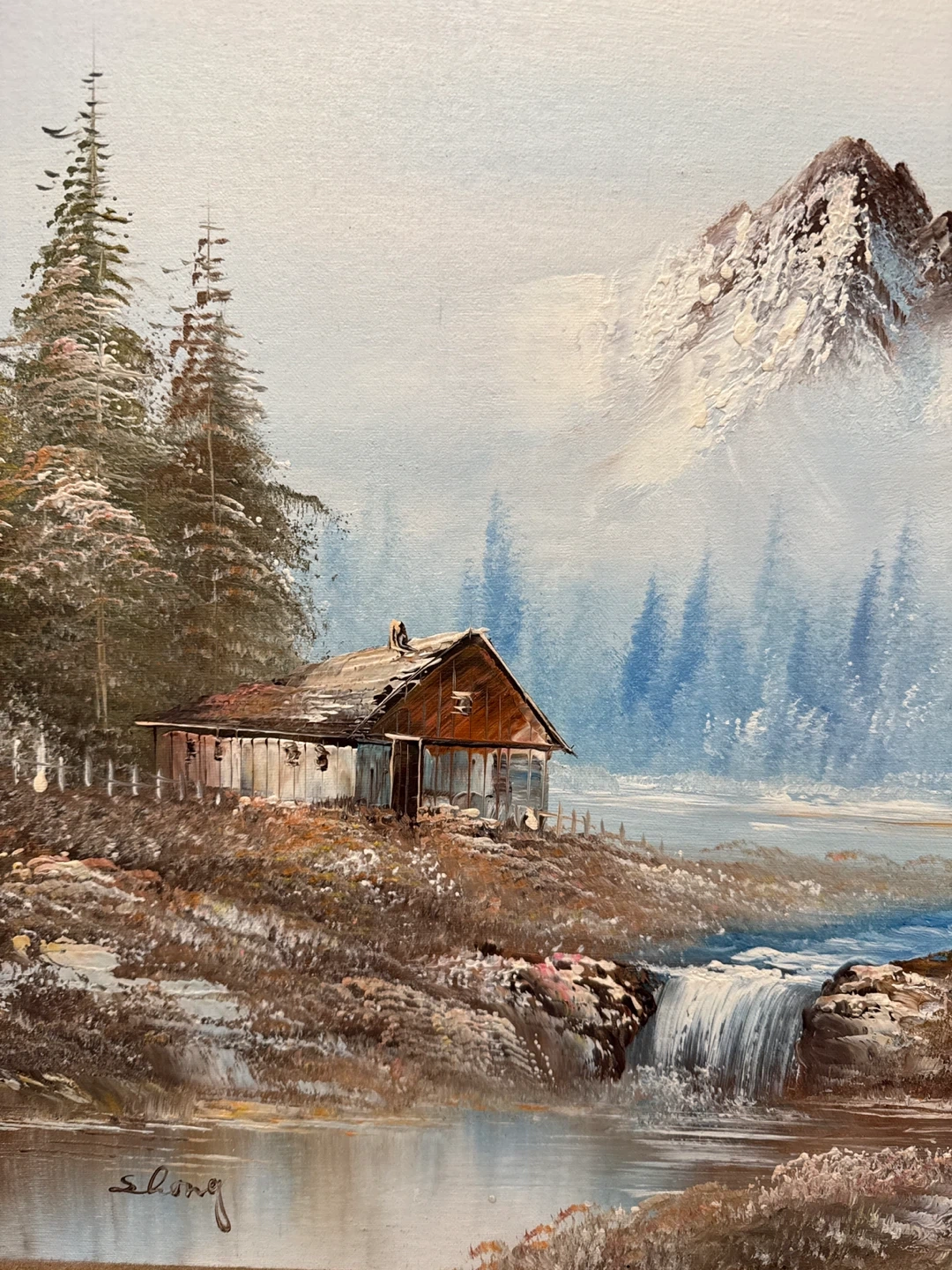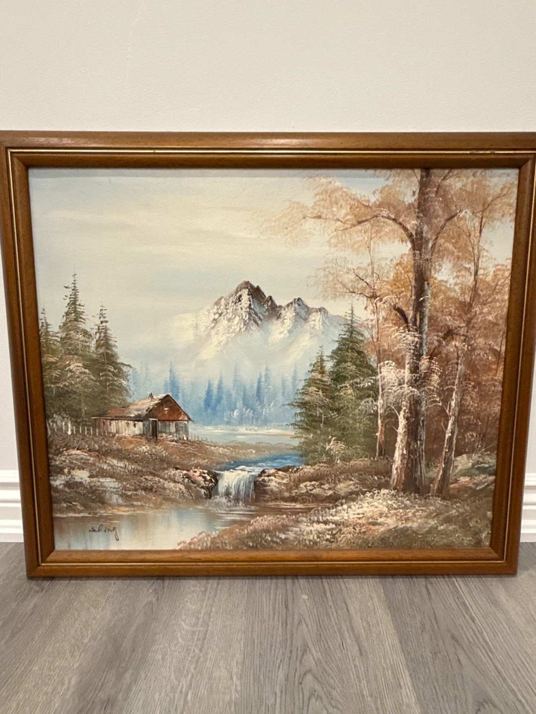 Selling a beautiful framed oil painting of a serene landscape. The artwork depicts a cabin by a waterfall with majestic mountains in the background. The frame is made of wood. It's a lovely piece for any home!