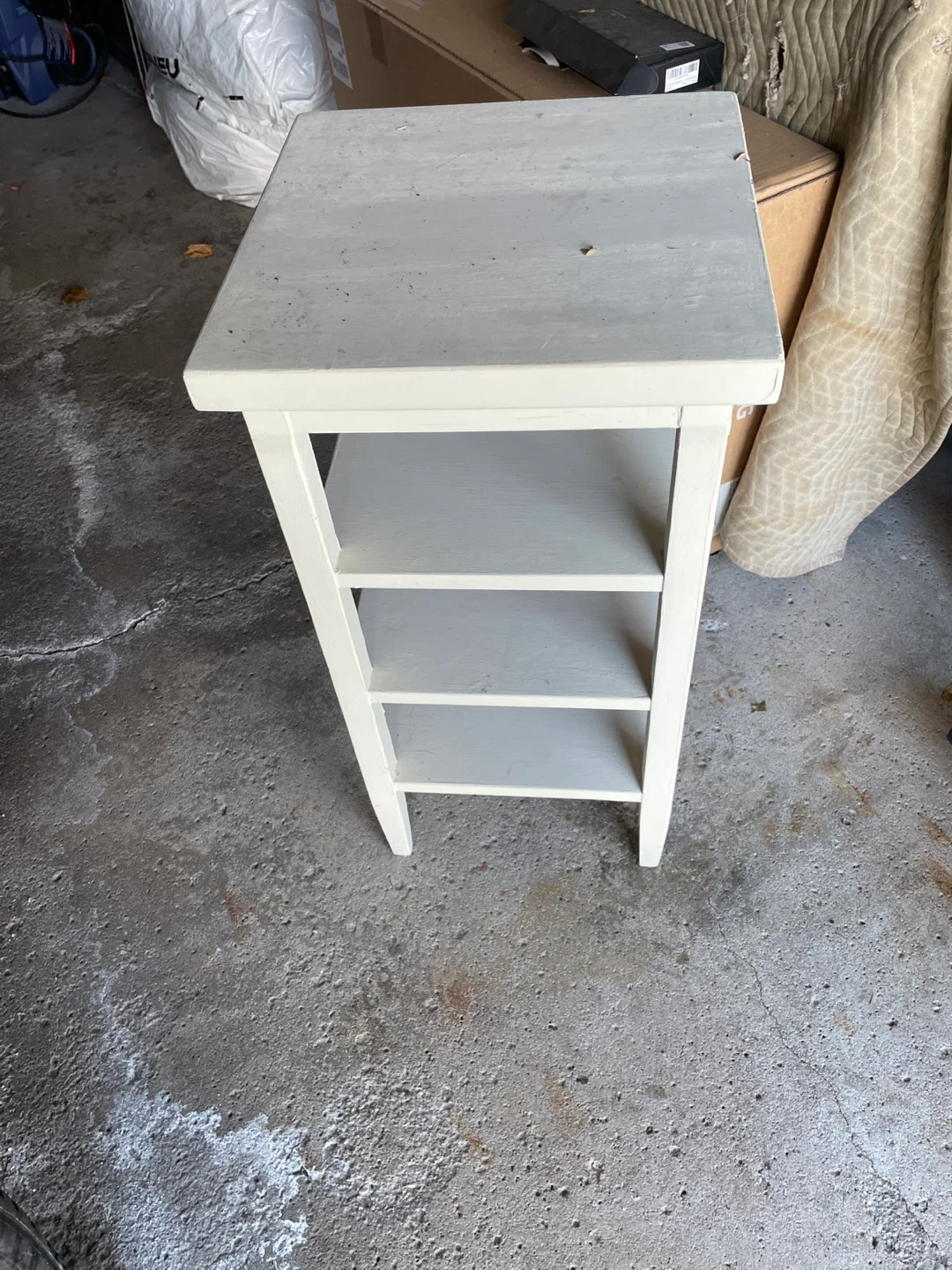 A simple white three-tier side table. It has a painted finish and offers two shelves for storage. This table is great for small spaces and can be used next to a couch or bed.