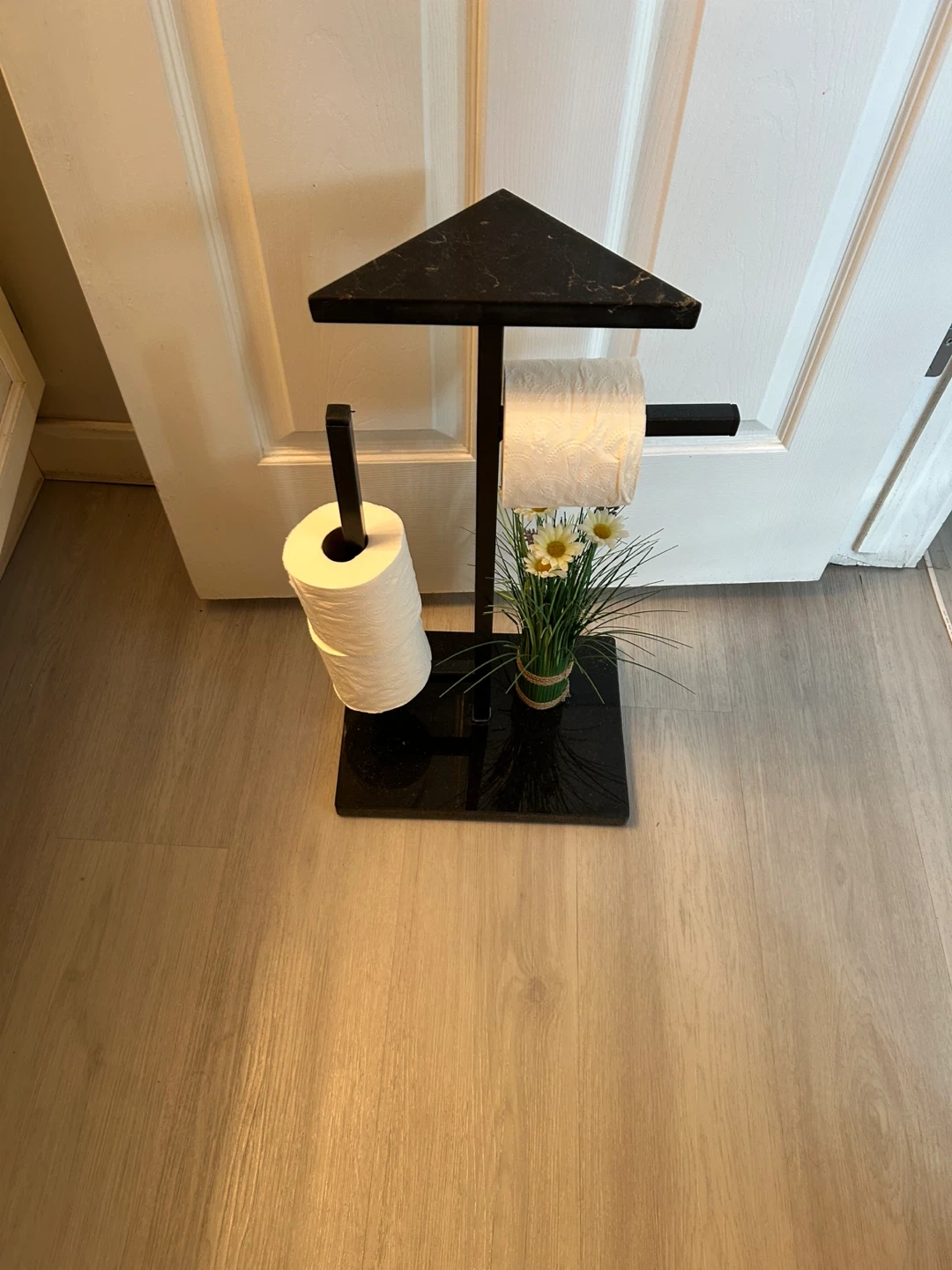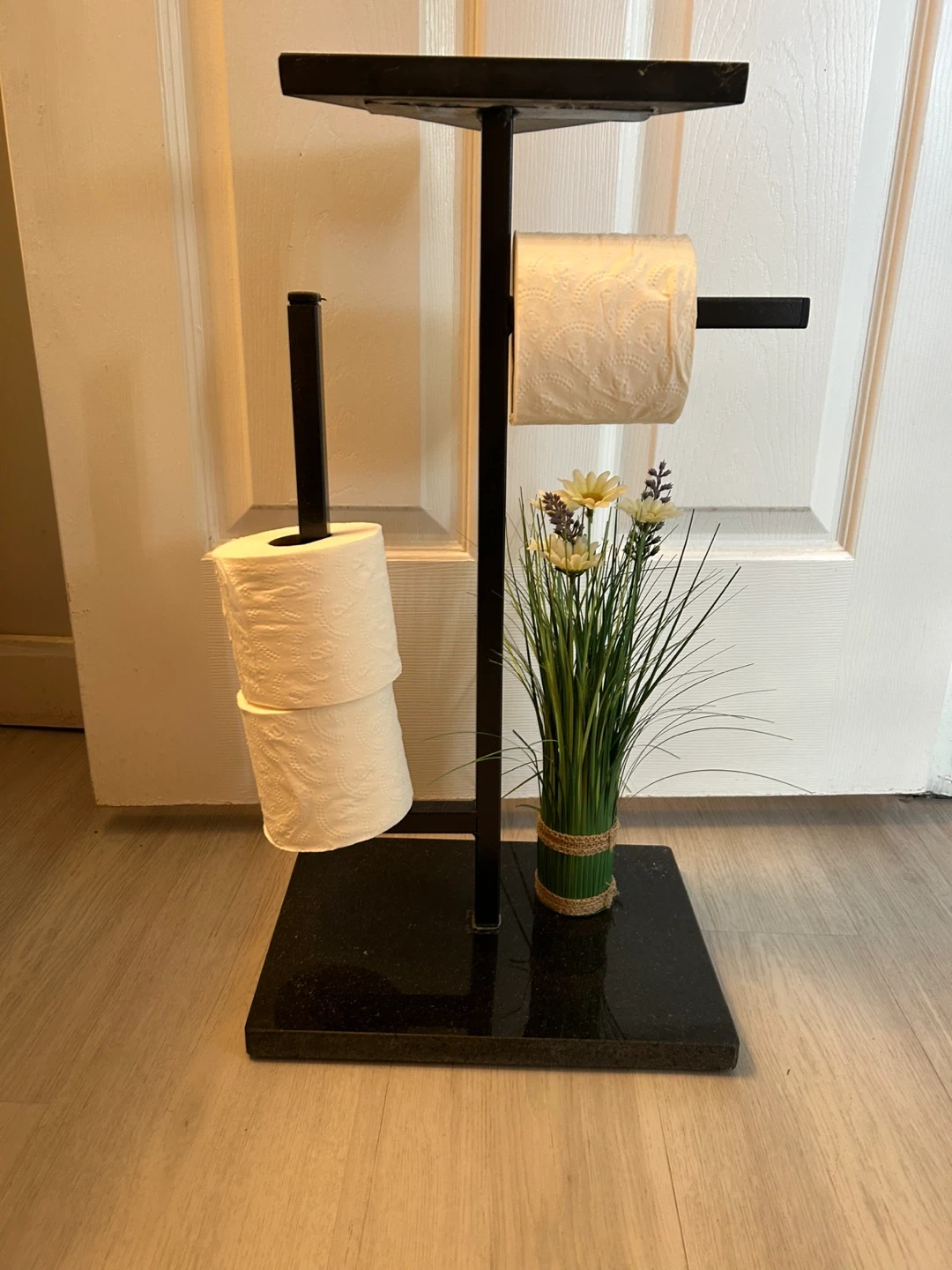 This toilet paper holder stand features a black marble base with a sleek black metal frame. It holds two rolls of toilet paper and includes a small decorative faux plant with flowers. Perfect for keeping extra rolls handy in your bathroom!