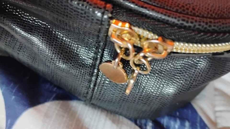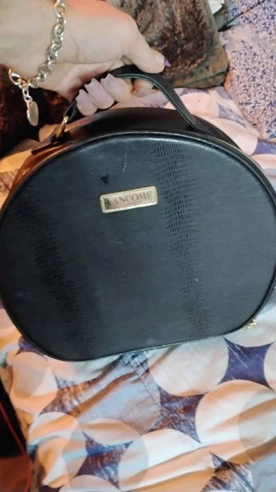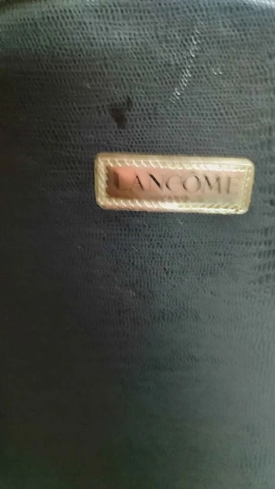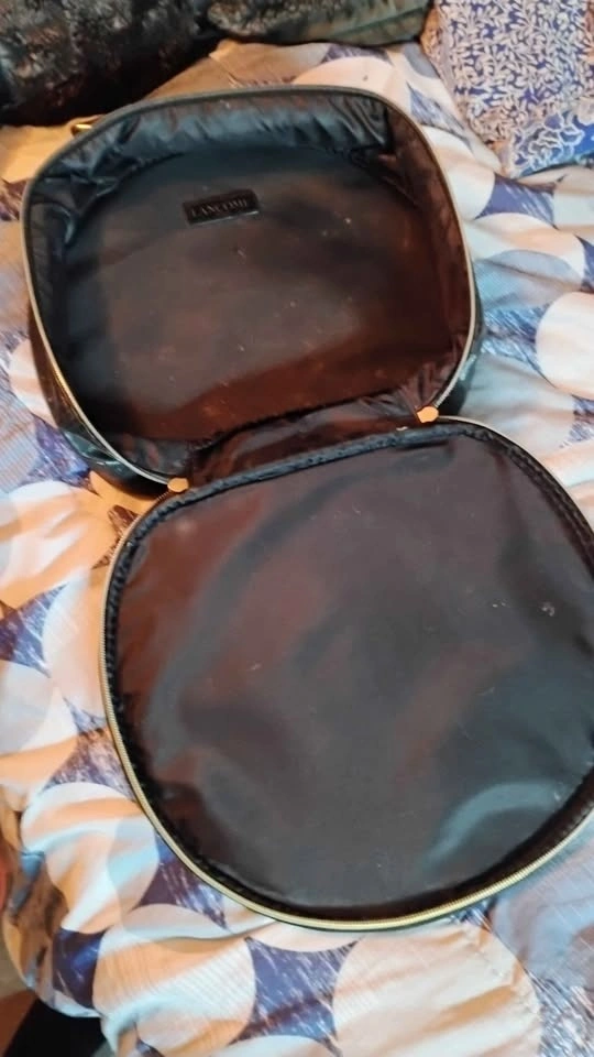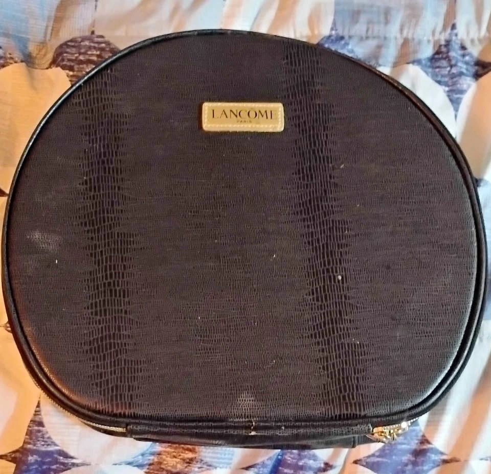 Black round makeup case with textured exterior and gold 'LANCOME PARIS' label. Has a zipper closure and handle. Minor scratches on the exterior.