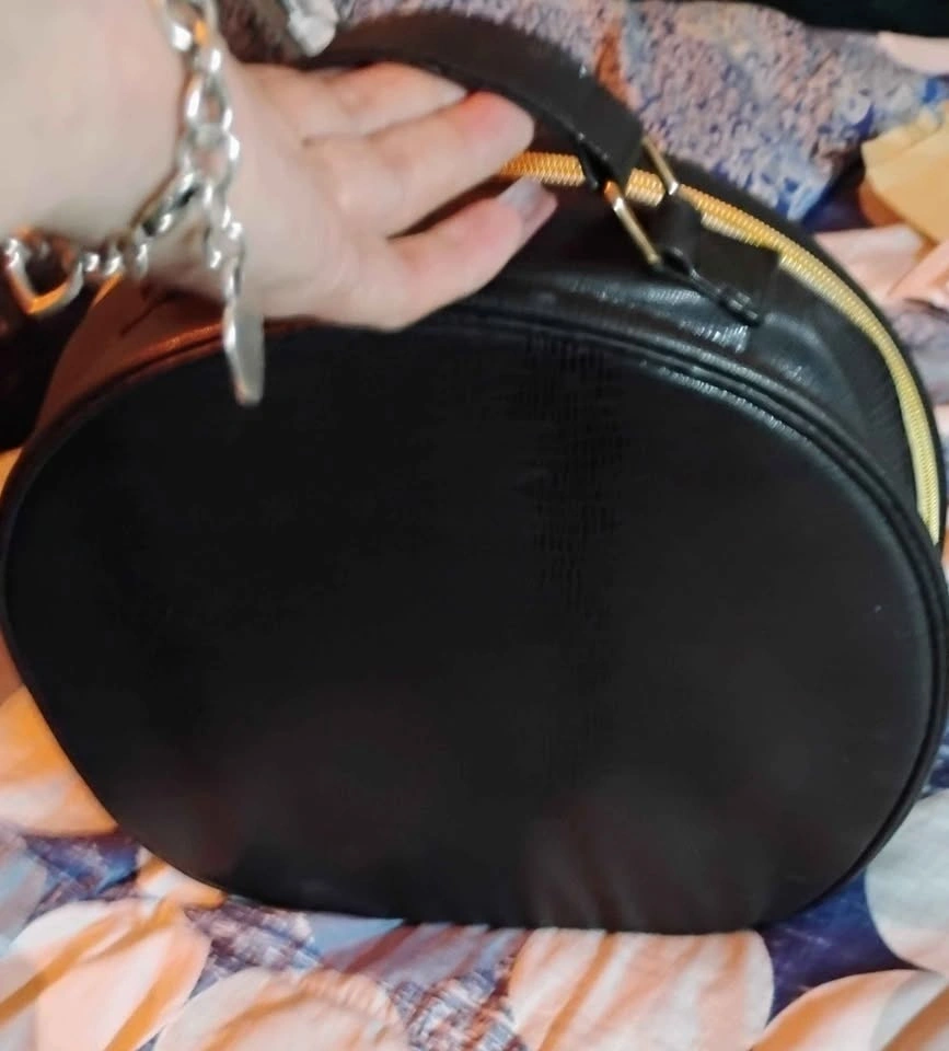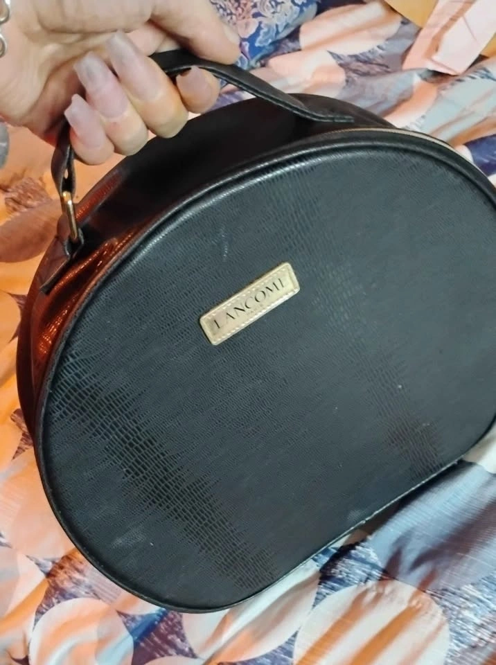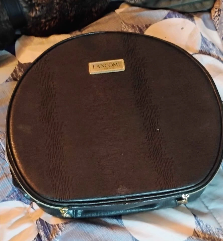 Black round makeup case with textured exterior and gold 'LANCOME PARIS' label. Has a zipper closure and handle. Minor scratches on the exterior.
