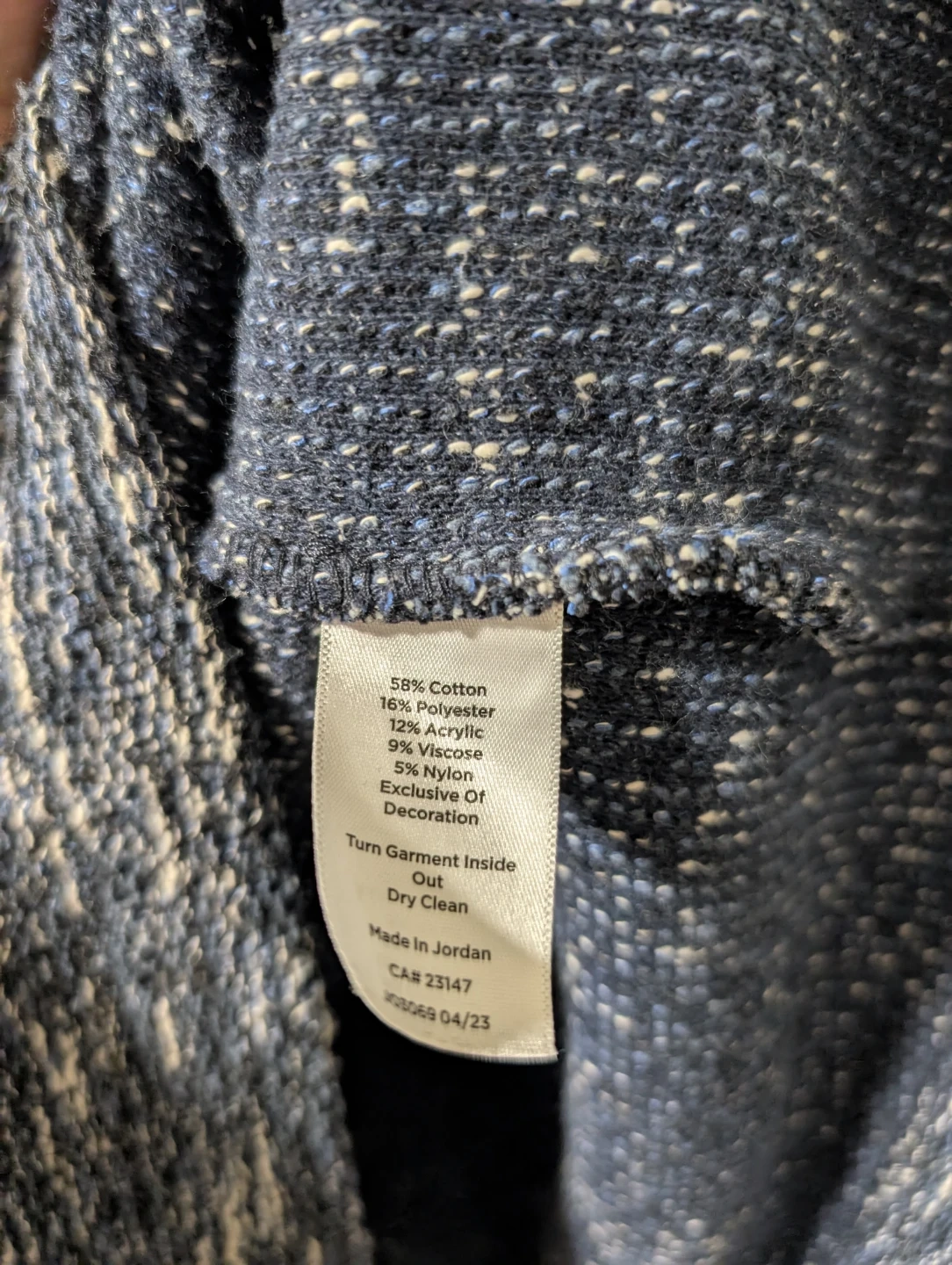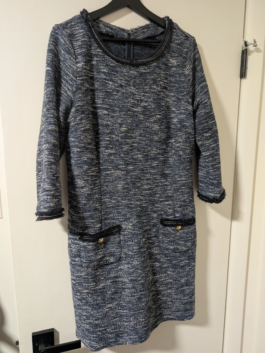 Talbots Petite dress in a speckled blue tweed fabric. It has two front pockets with decorative buttons and trim. Size is 16 Petite.