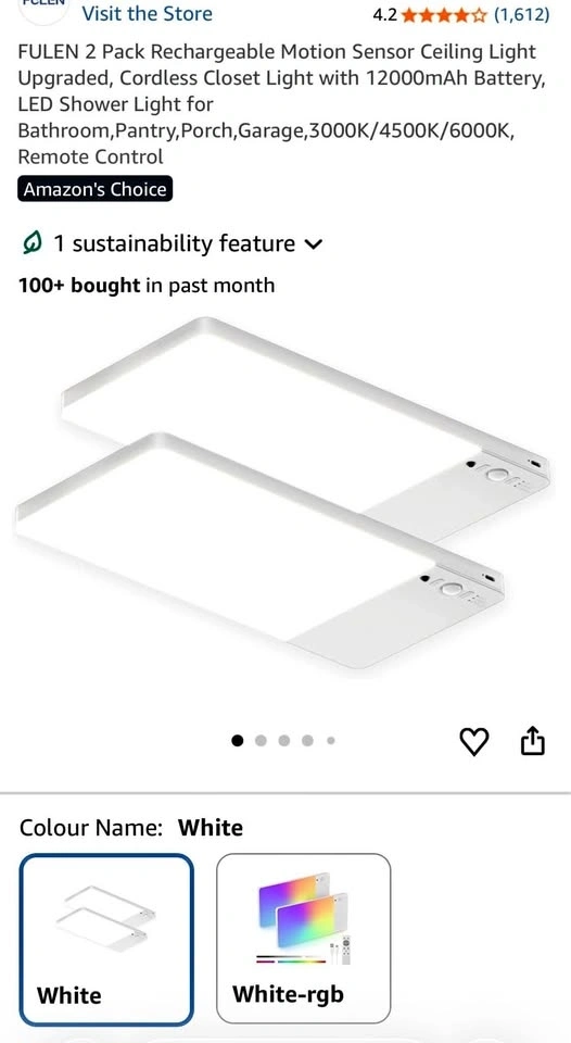 2 Pack Rechargeable Motion Sensor Ceiling Lights. Upgraded, cordless closet lights with 12000mAh battery. Suitable for bathrooms, pantries, porches, and garages. Features adjustable color temperatures (3000K/4500K/6000K) and includes a remote control.