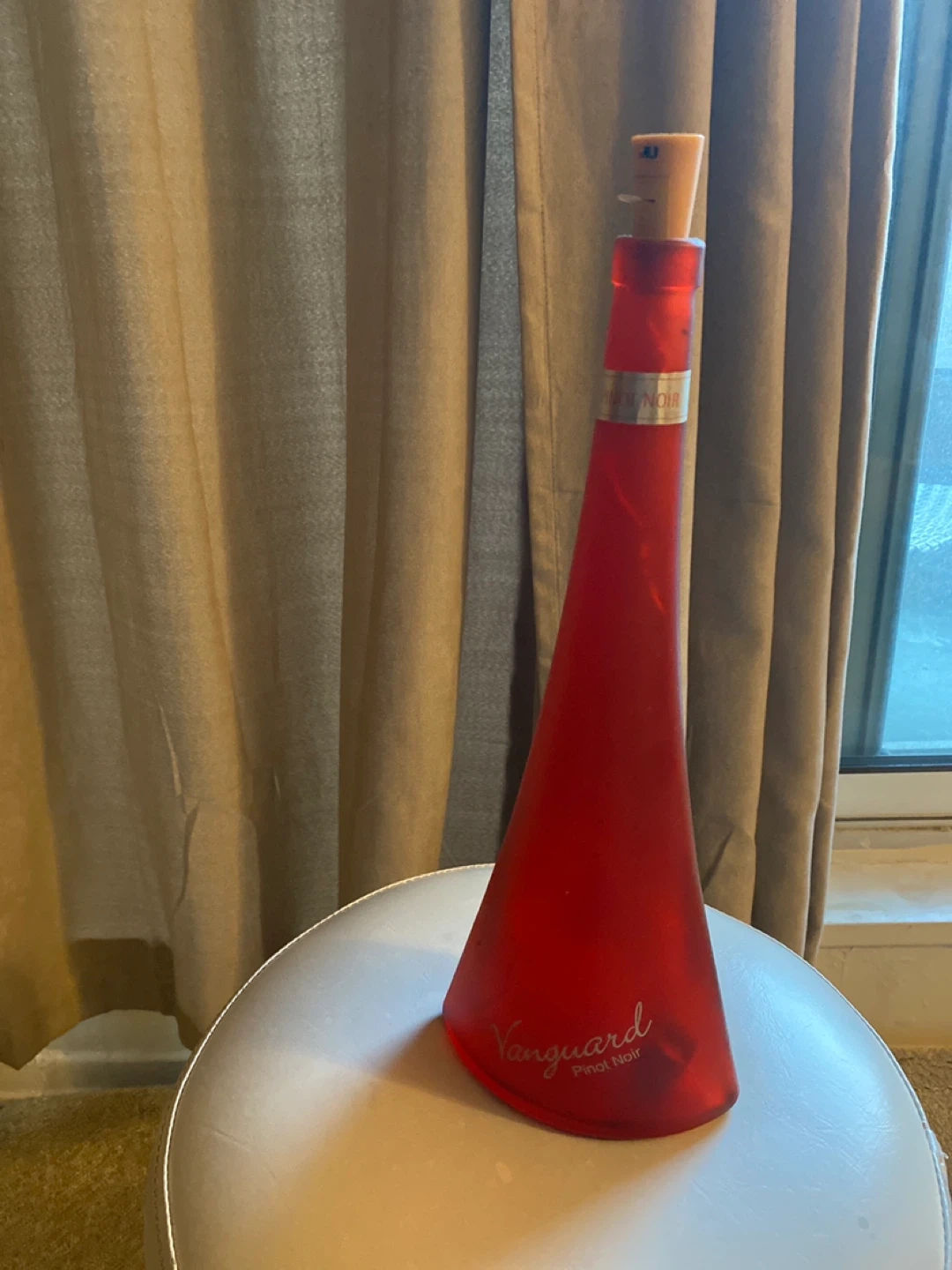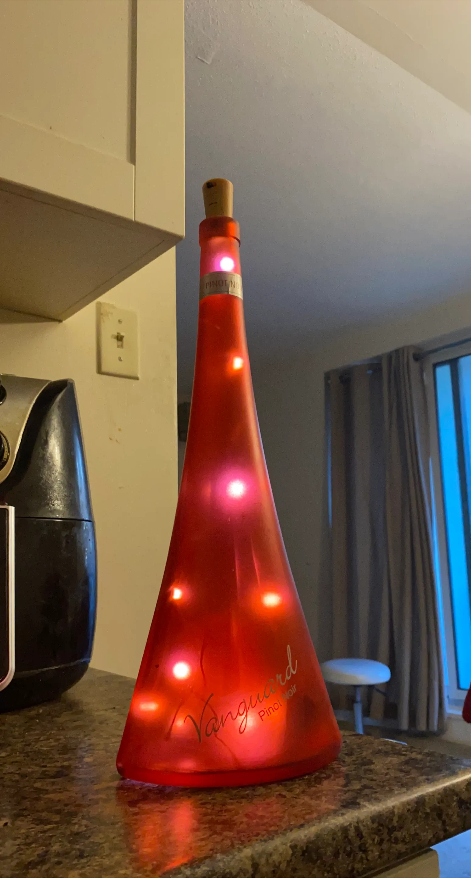 This is a decorative red bottle that has been filled with lights. It's branded Vanguard and says Pinot Noir on it. It has a cork stopper light controller with switch to on /off.