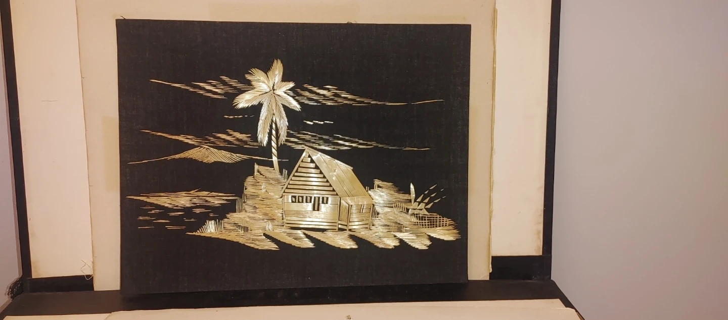 This unique piece features a charming tropical scene, complete with a palm tree and a hut, crafted from straw on a black background. It's a lovely decorative item that brings a bit of the tropics to your home. The intricate detail showcases a skilled hand and offers a warm, natural aesthetic.