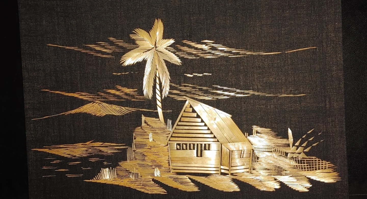 This unique piece features a charming tropical scene, complete with a palm tree and a hut, crafted from straw on a black background. It's a lovely decorative item that brings a bit of the tropics to your home. The intricate detail showcases a skilled hand and offers a warm, natural aesthetic.