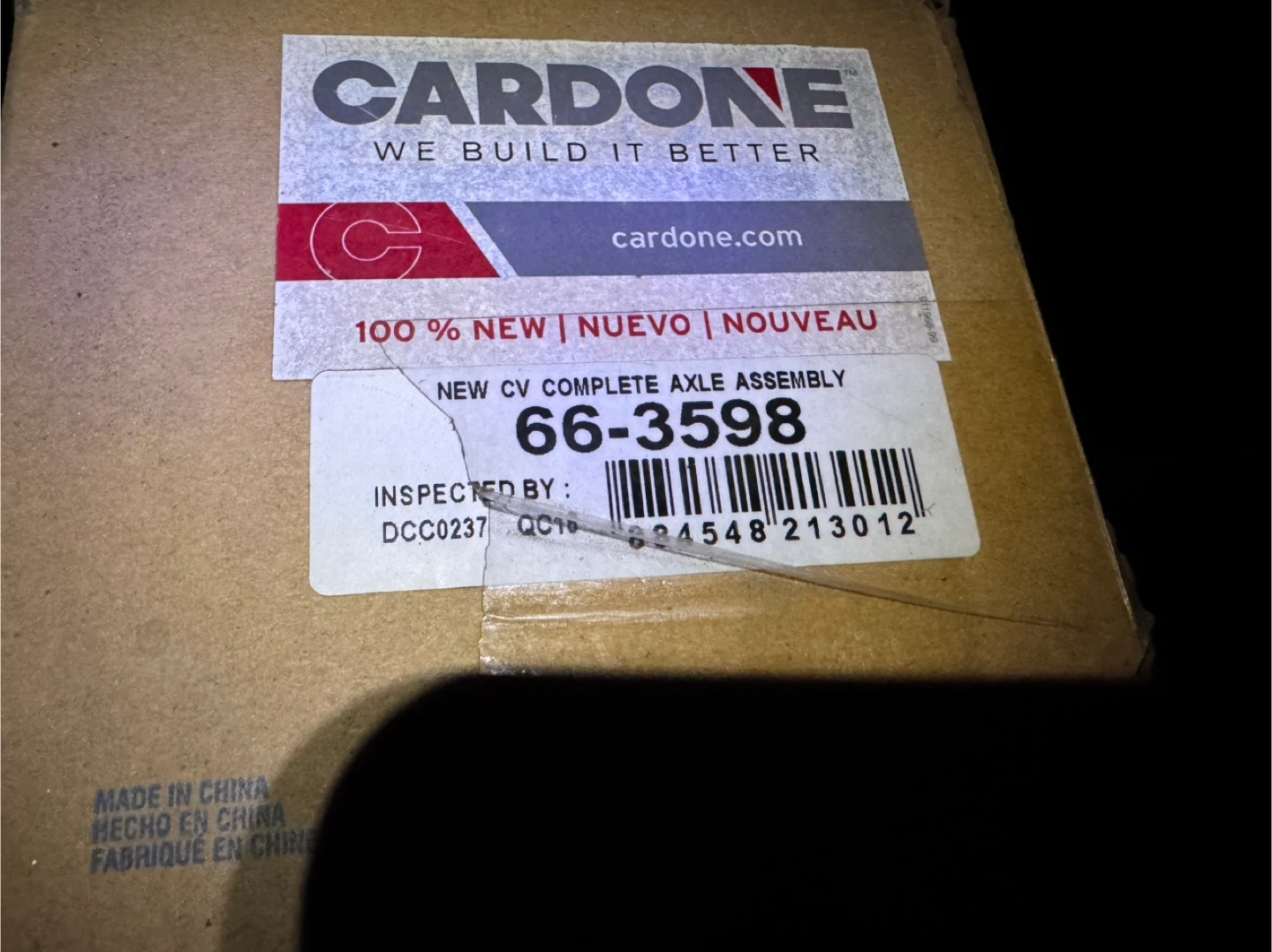 This is a new CV axle assembly from CARDONE, part number 66-3598. It's designed for Dodge Caliber 2007-2008, Jeep Compass 2007-2017, and Jeep Patriot 2007-2017. This is a left rear axle for a 4-wheel drive vehicle. Located in Penticton