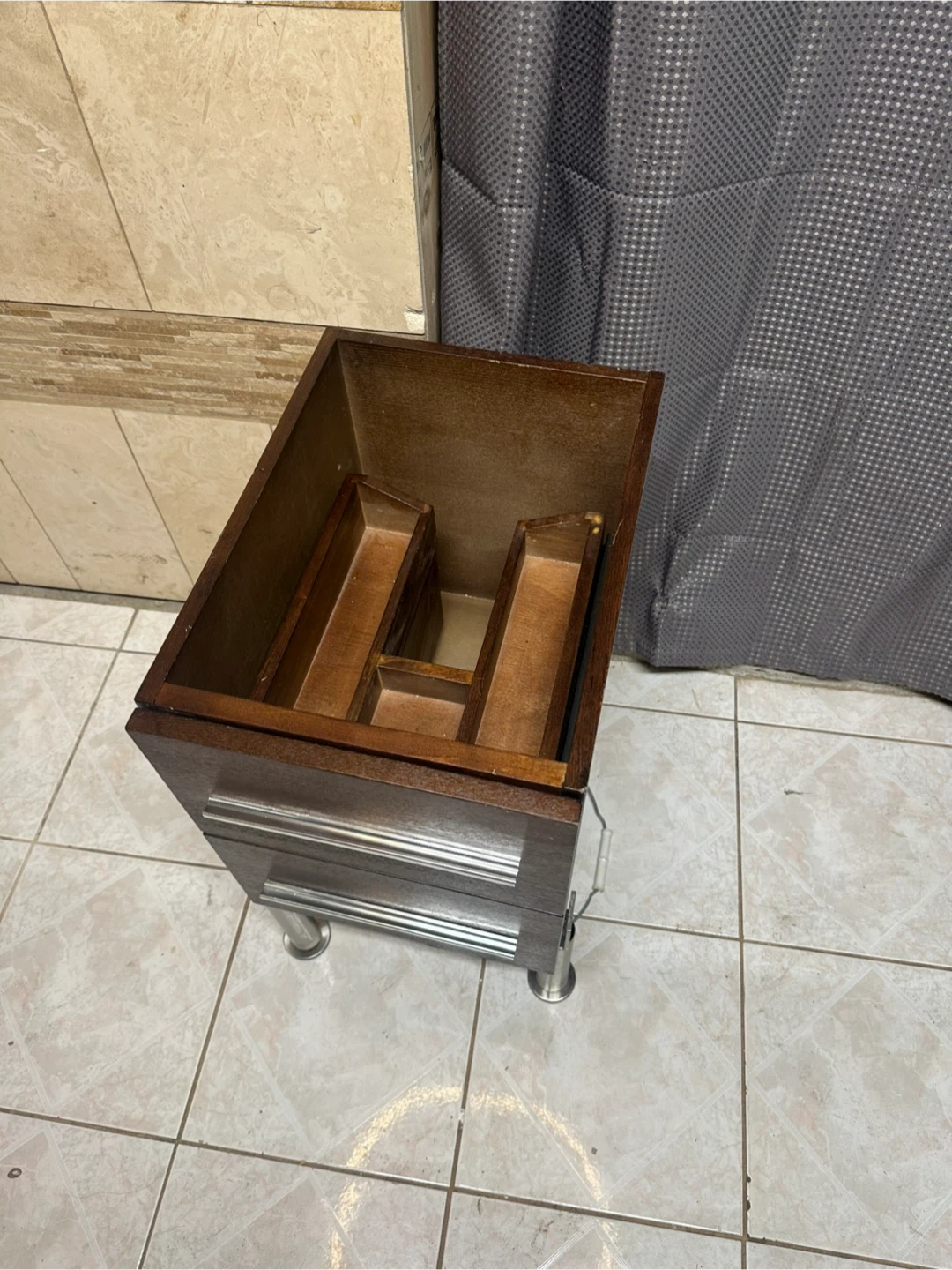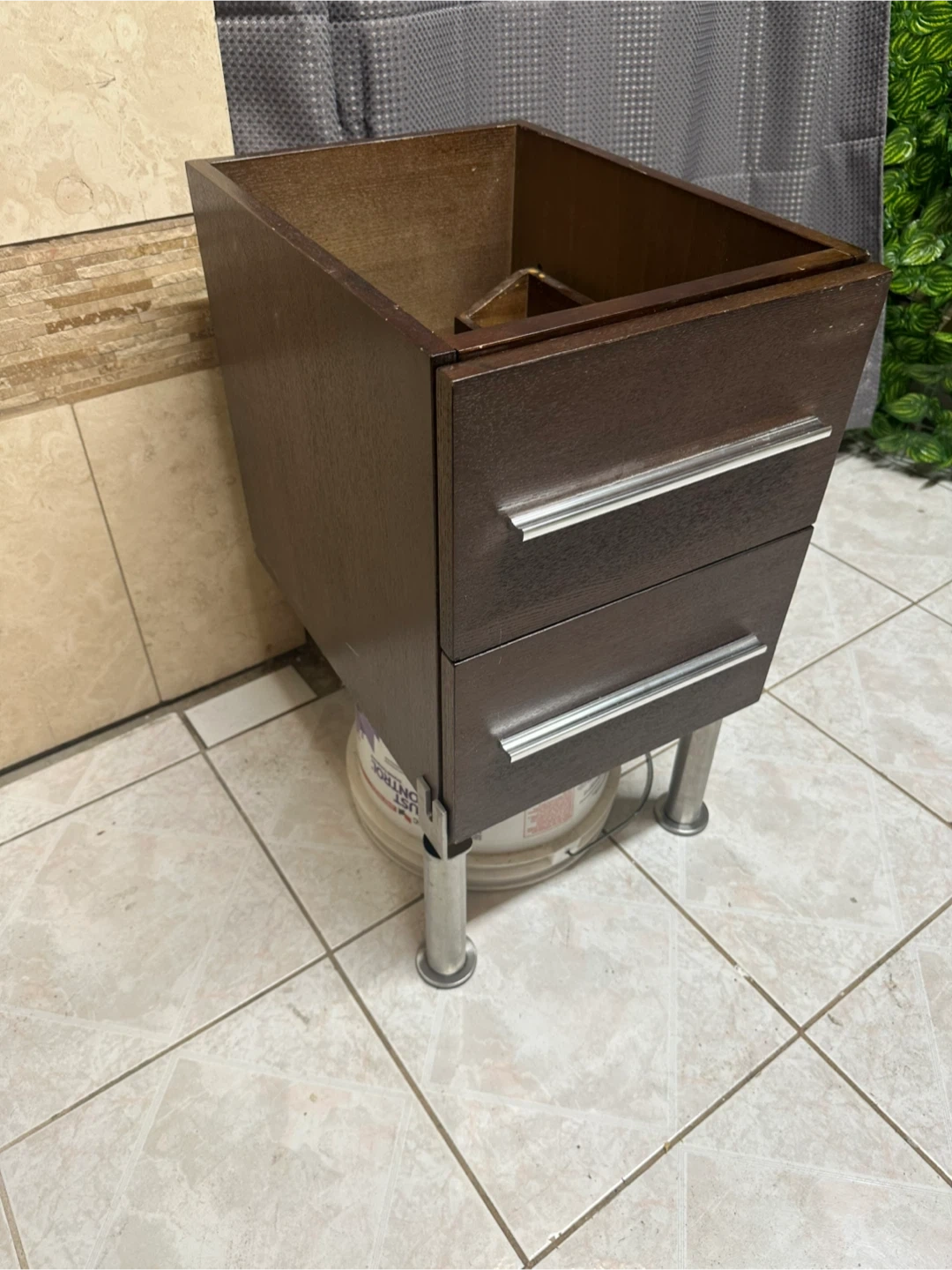 Dark wood cabinet featuring two smooth‑sliding drawers with long metal handles.