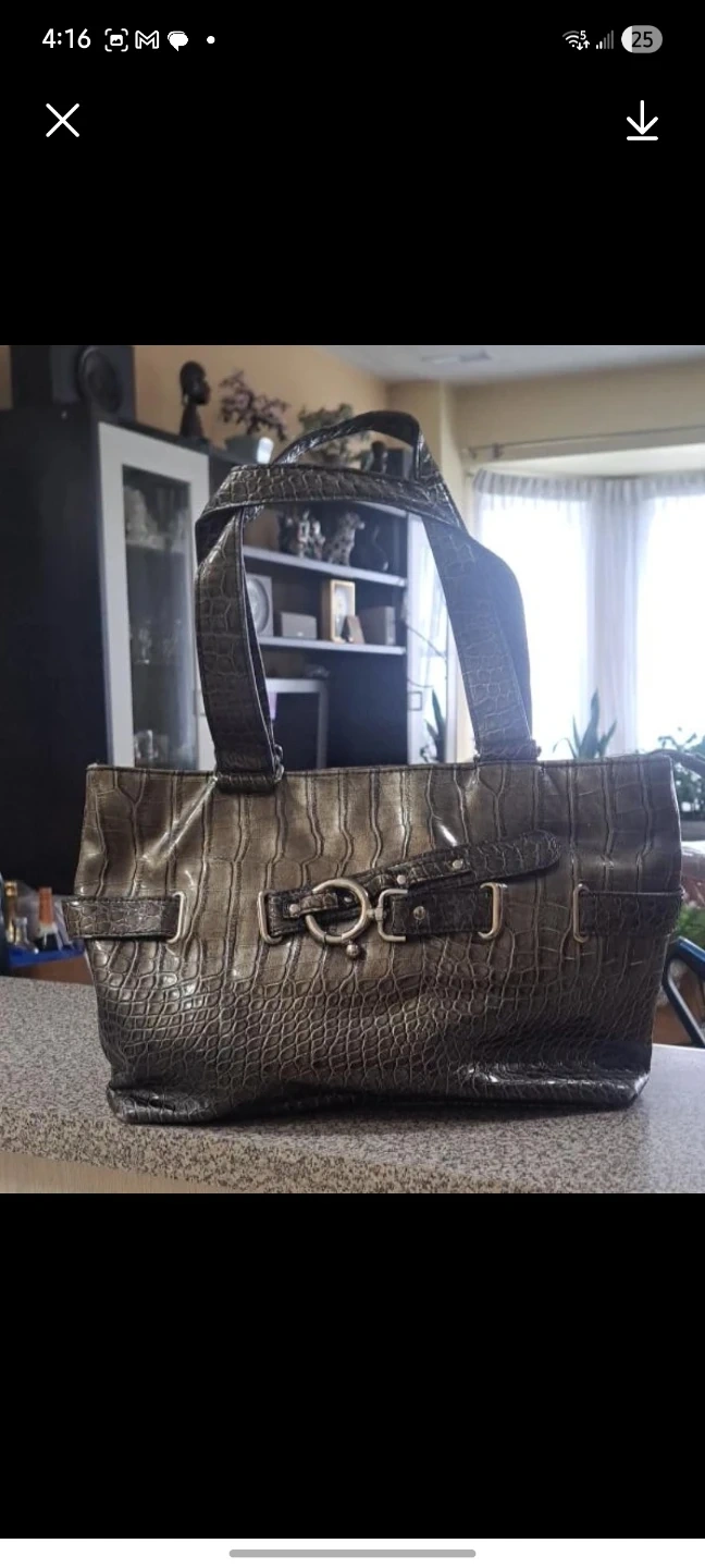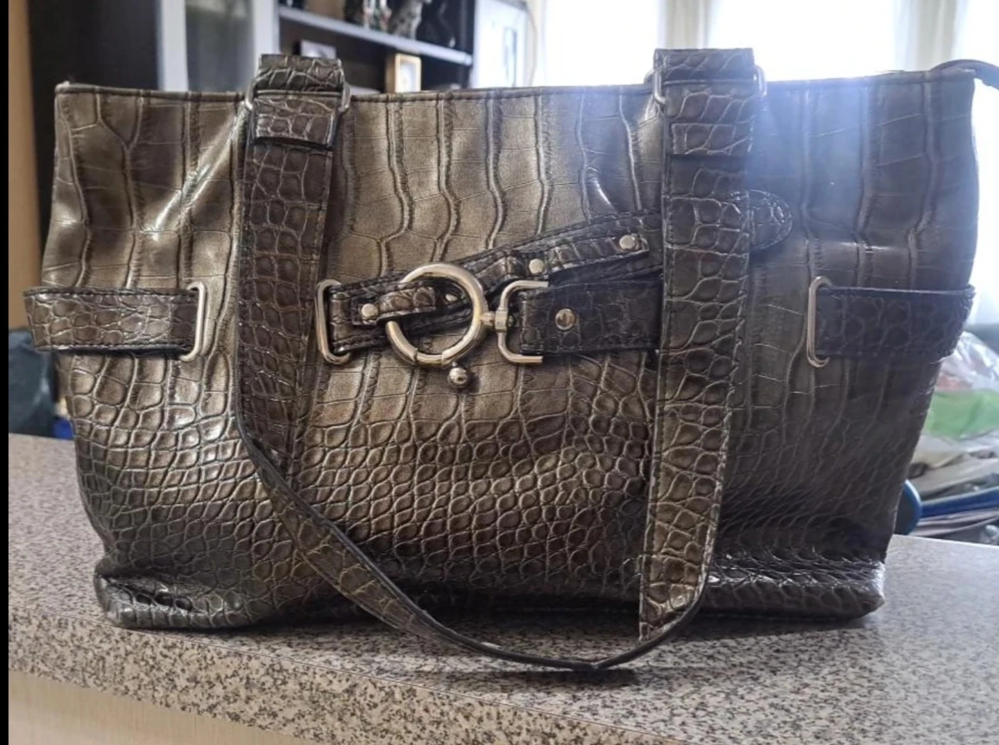 This tote bag features a stylish crocodile embossed texture. It has a spacious main compartment with a secure closure. The sturdy handles make it easy to carry.