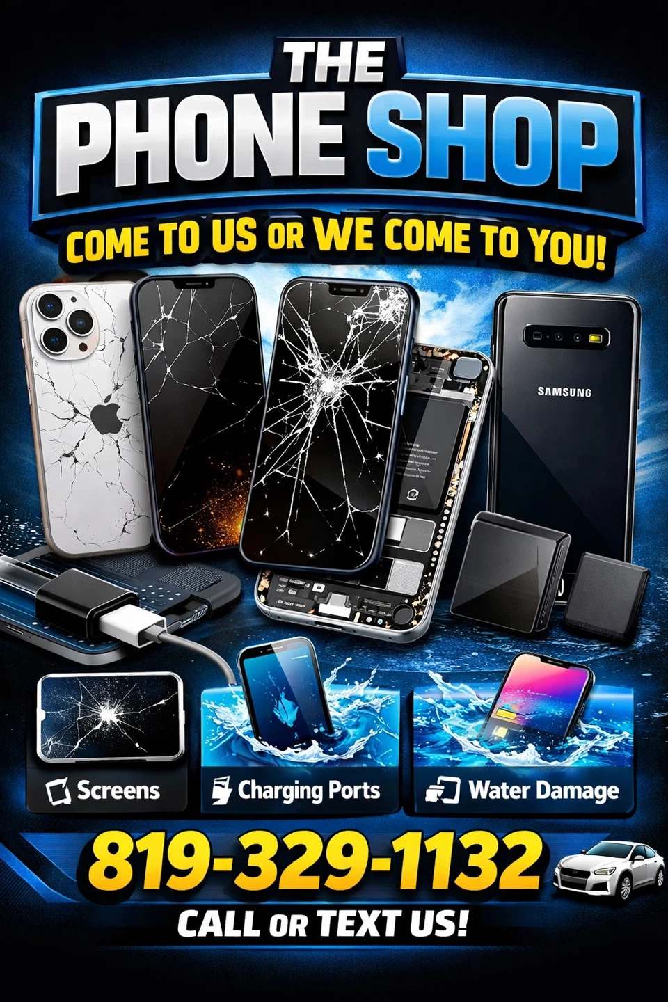 The Phone Shop offers comprehensive repair services for your mobile devices. We fix cracked screens, charging port issues, and water damage. We can come to you or you can come to us!