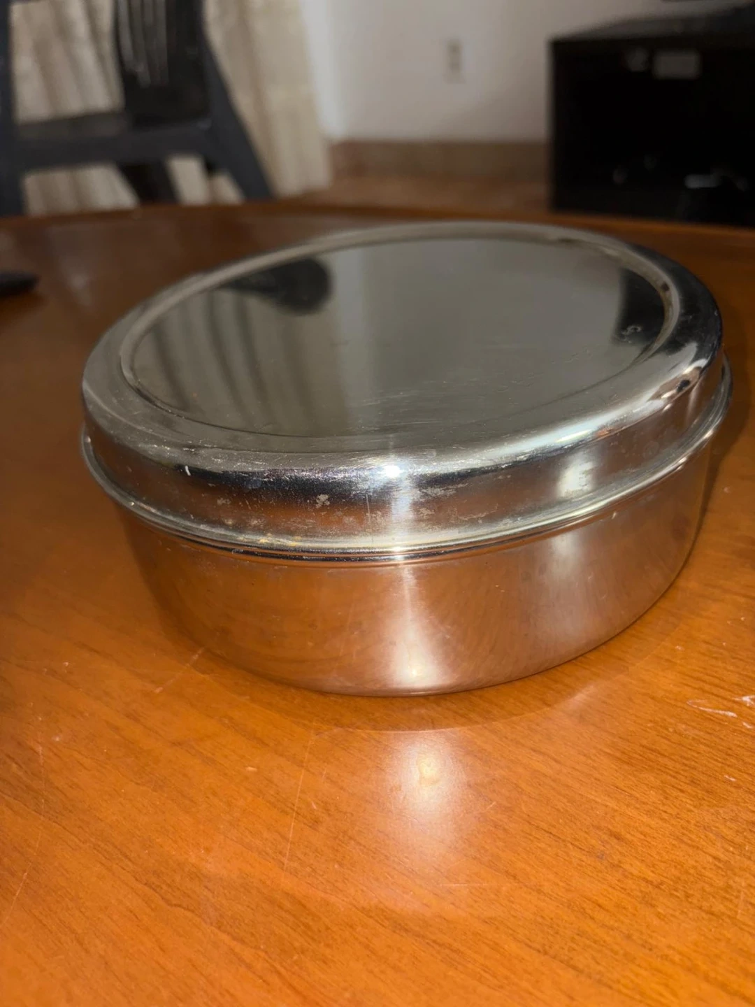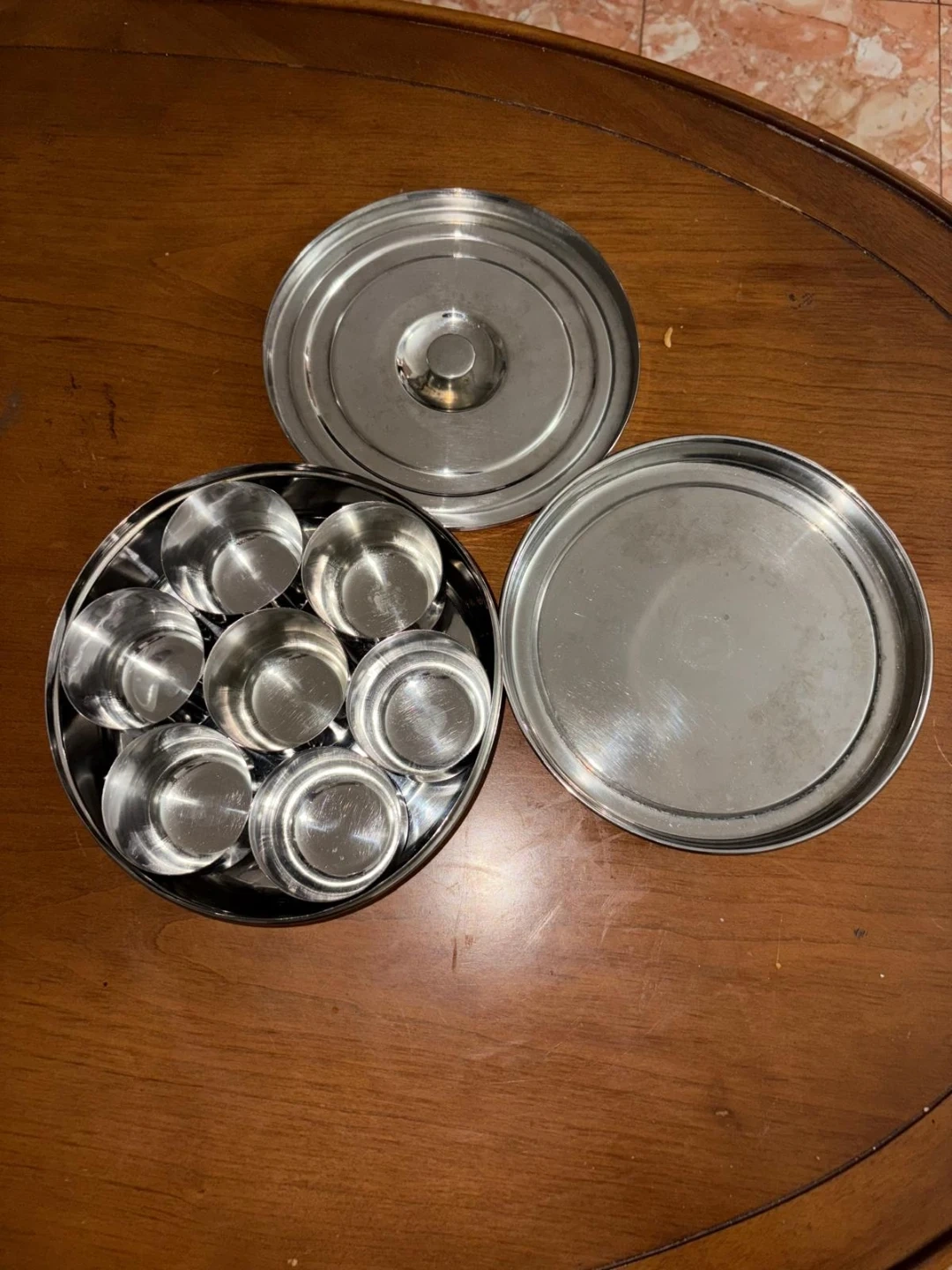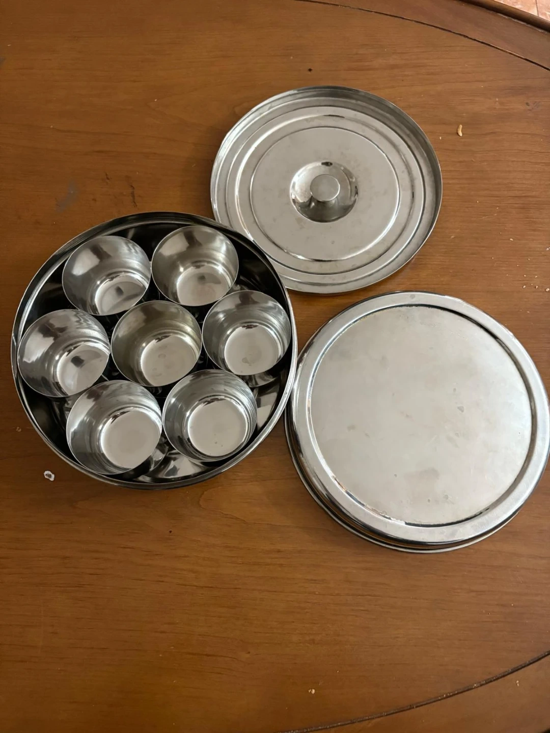Selling a stainless steel masala dabba, perfect for organizing your spices! It comes with individual bowls and lids to keep everything fresh and accessible. Great for any kitchen!