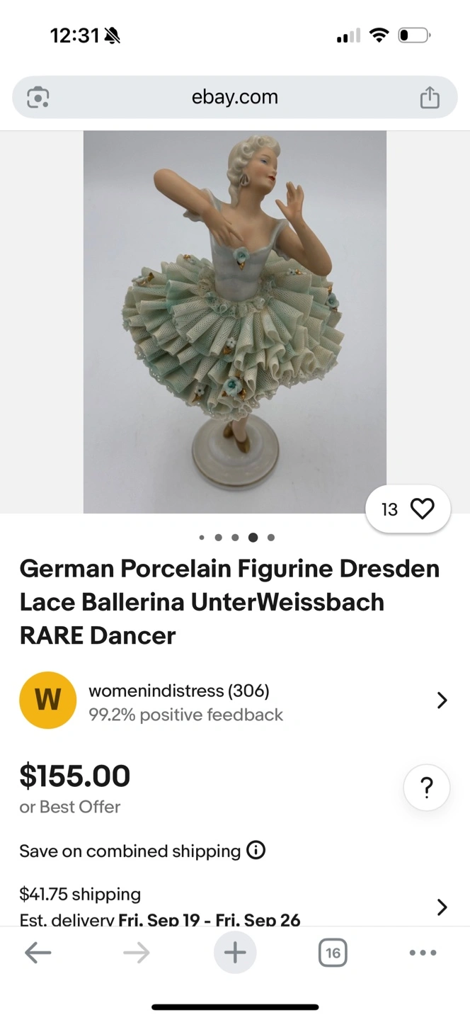 This lovely Antique German Dresden Lace Porcelain Ballerina Dancer Figurine is a rear piece from 1940-1960s. Stunning condition.