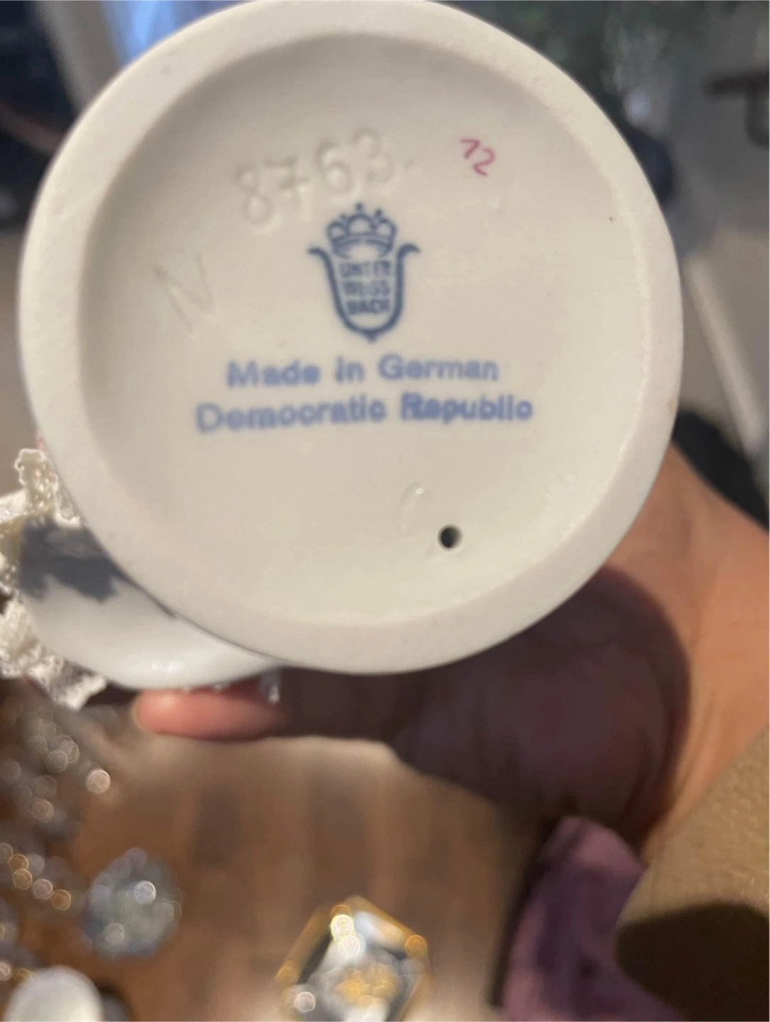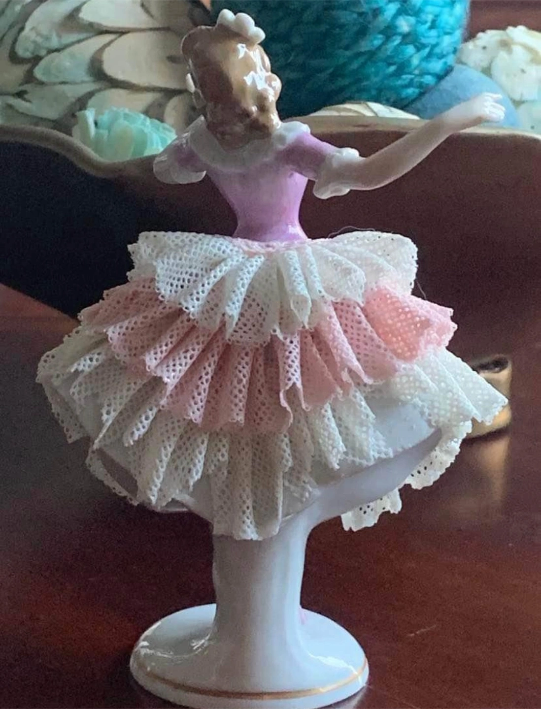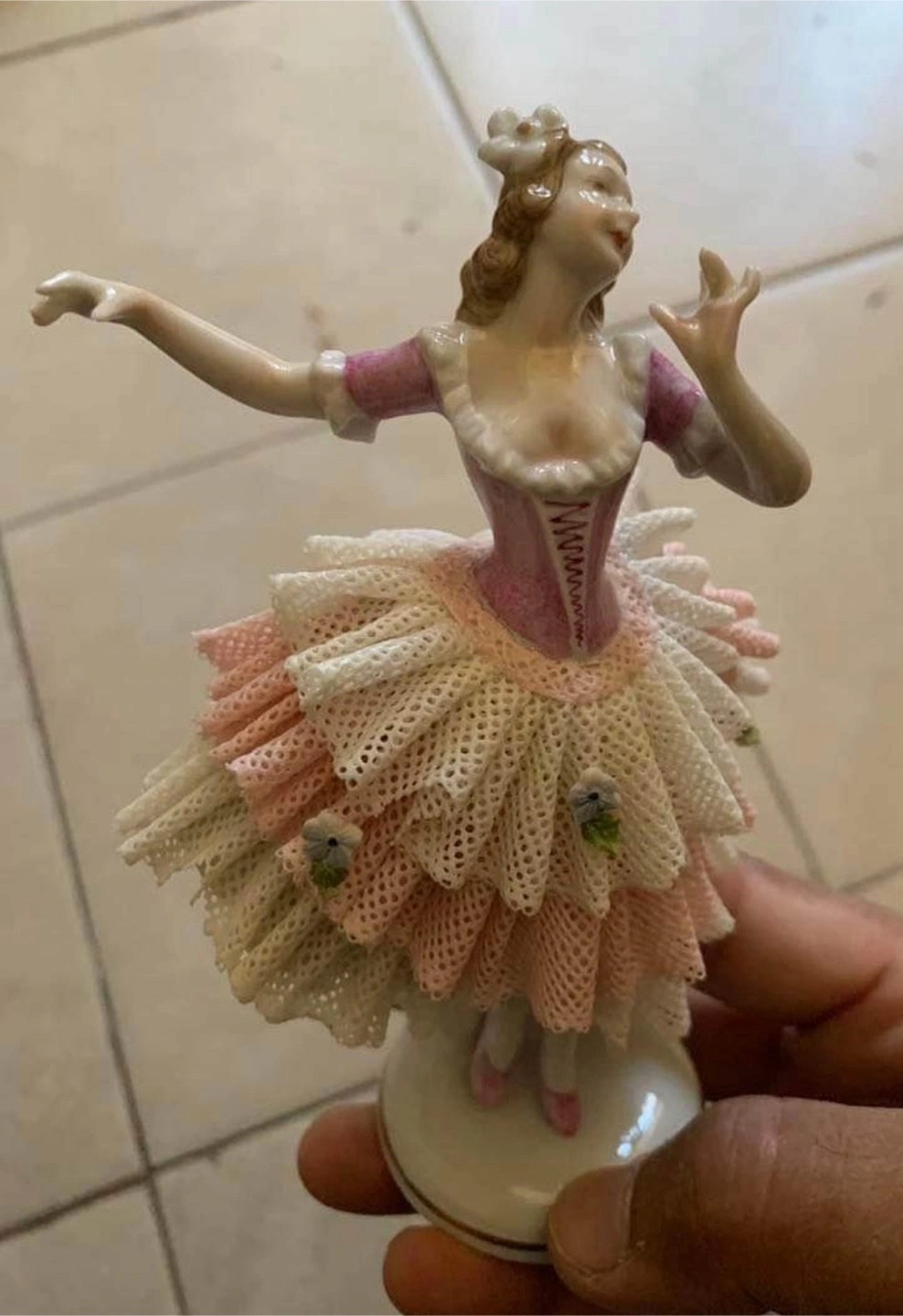 Made in German Democratic Republic. It features a delicate pink and white lace tutu. Lace is in very good condition. Small piece missing on the back. A charming piece for any collector!