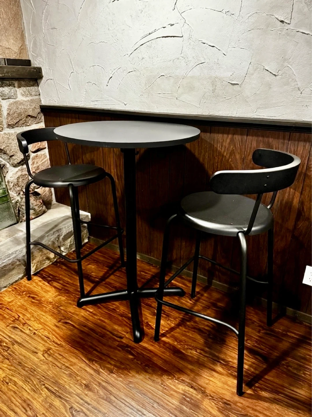 A round bistro table with two black bar stools. Metal construction. Perfect for a small kitchen or dining area.