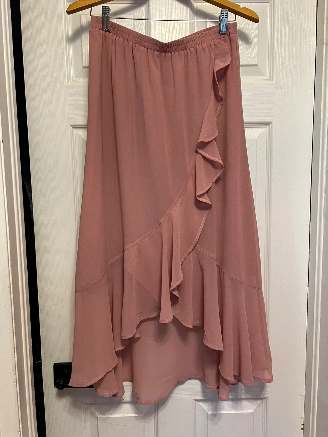 This is a beautiful dusty rose chiffon maxi skirt. It features an elastic waistband and a ruffled asymmetrical hemline. It's a flowy, tiered design that's perfect for warmer weather occasions. Chiffon material.