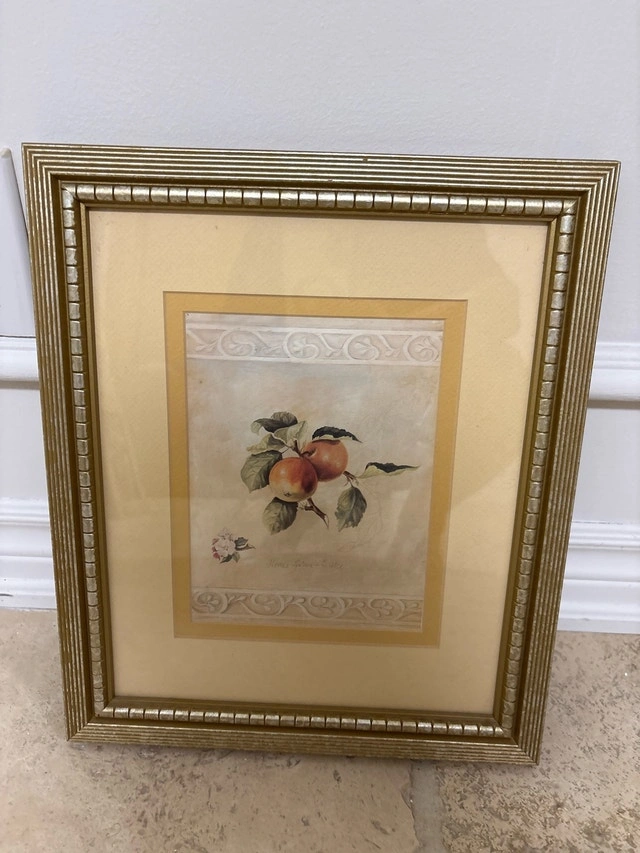 This is a lovely framed piece, perfect for adding a touch of charm to any room, with dimensions of approximately 12.5 inches by 15 inches. The print features a delicate apple motif in warm tones and is surrounded by a complementary gold-toned frame. The piece is previously owned, but its condition is very good. It would make a great addition to any home. Cash accepted.