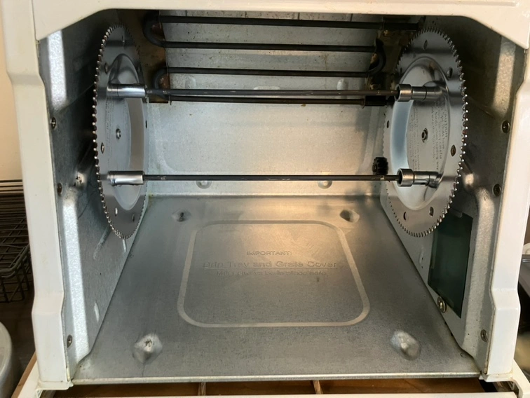 Includes rotisserie spit, drip tray, and oven rack. Also comes with a pair of heat resistant gloves and an instruction manual. Perfect for roasting chickens and other meats. Great for small spaces!