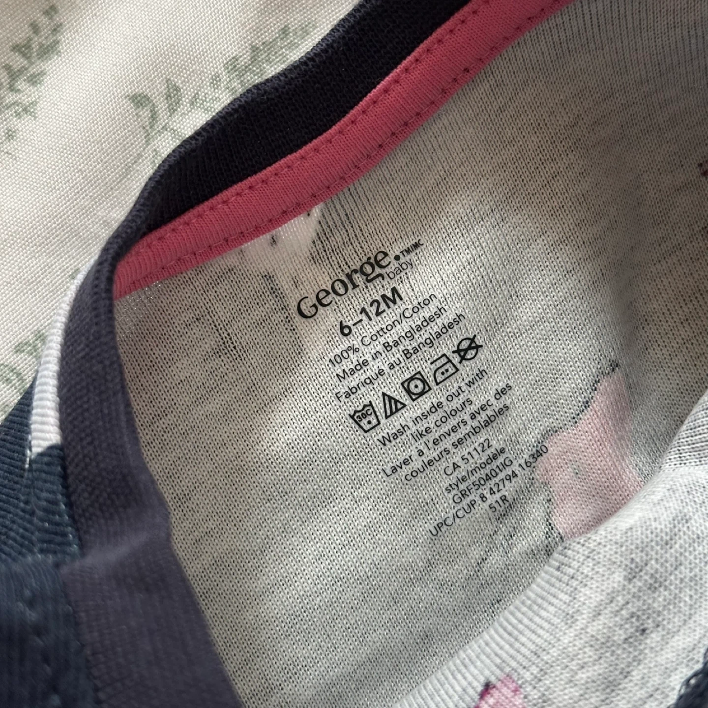 George baby girls 2-piece pajama set. Made of 100% cotton. Features a navy blue background with a cute dog print in pink and white. Size 6-12 months. Great for bedtime!