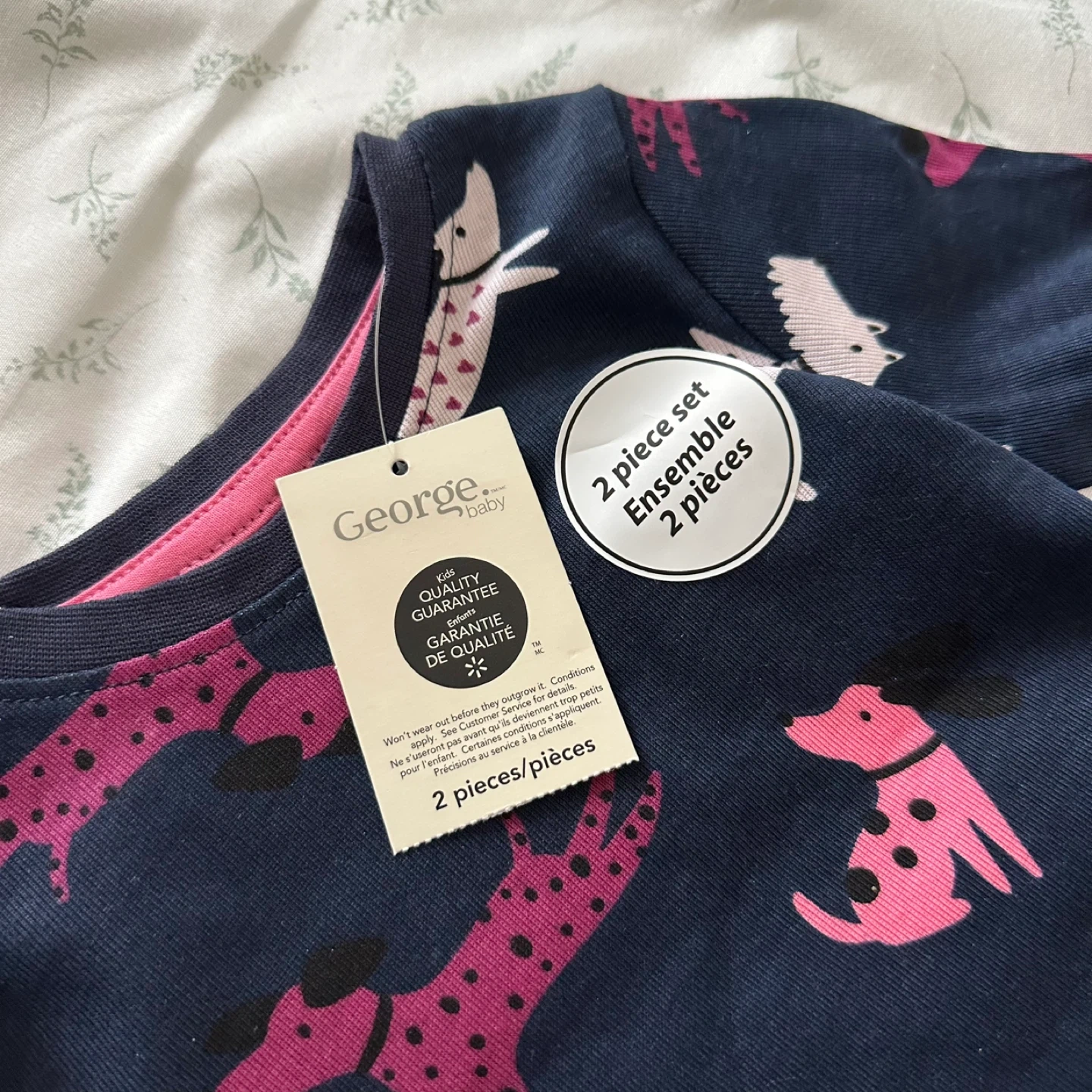 George baby girls 2-piece pajama set. Made of 100% cotton. Features a navy blue background with a cute dog print in pink and white. Size 6-12 months. Great for bedtime!