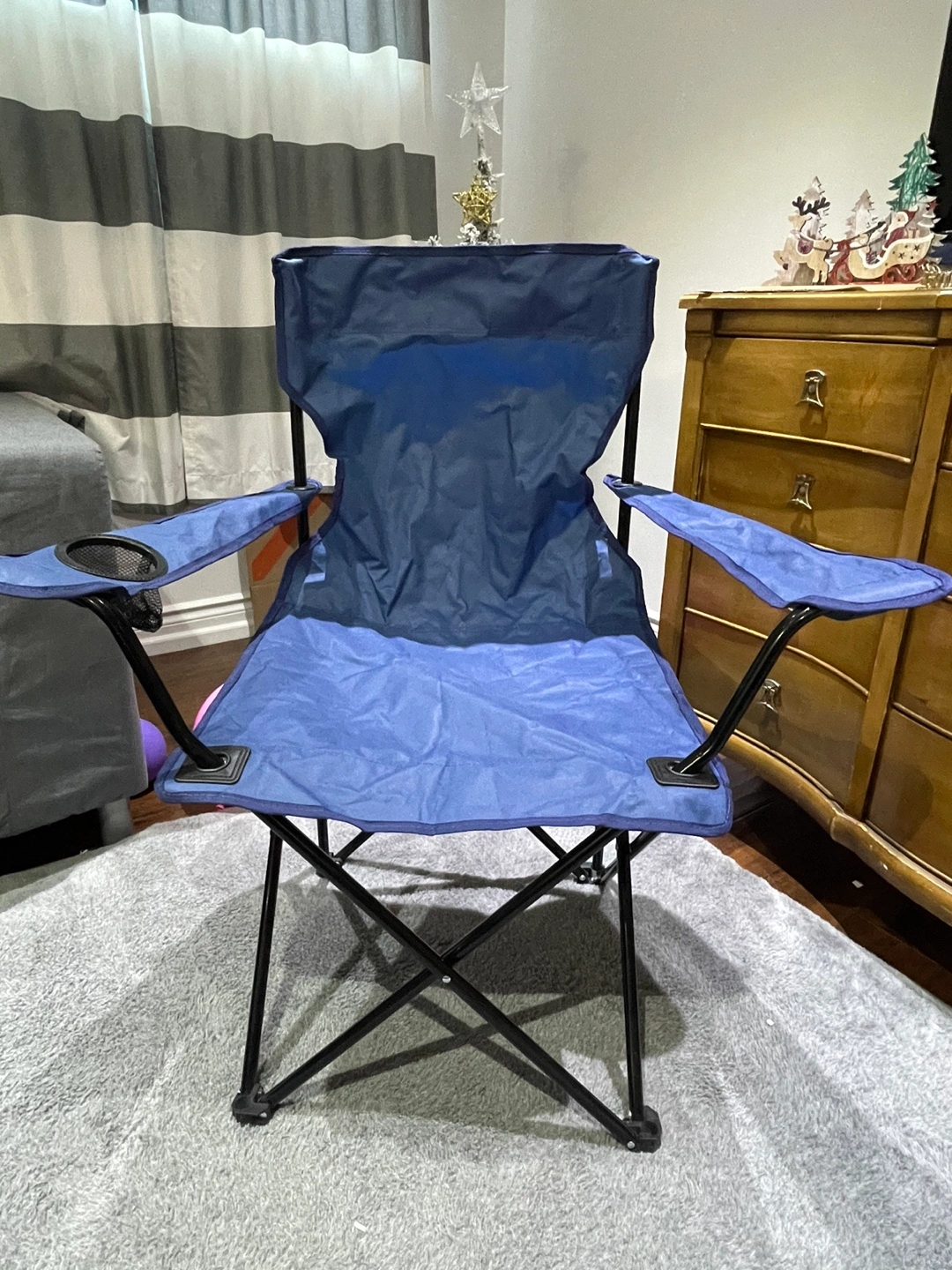 Blue folding camping chair with cup holders and armrests. Great for camping, picnics, or tailgating.