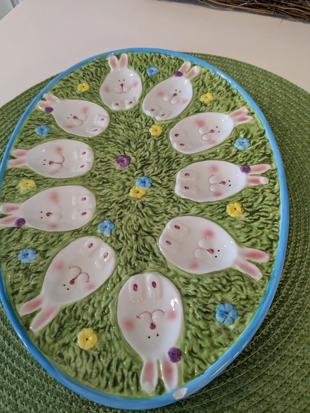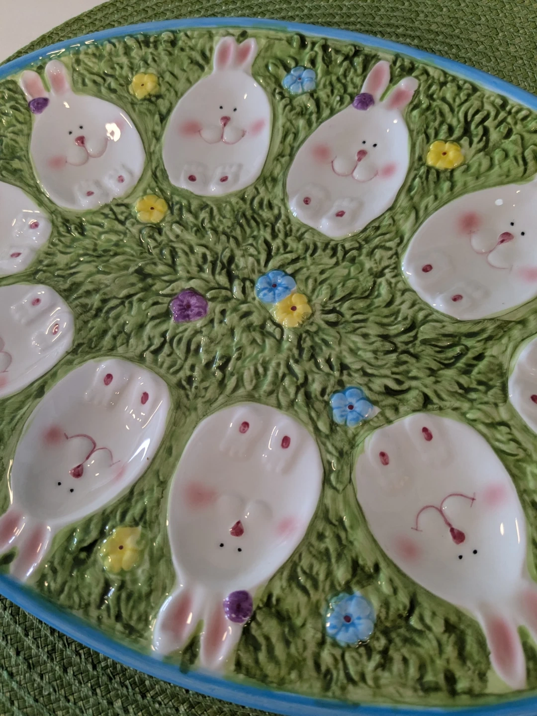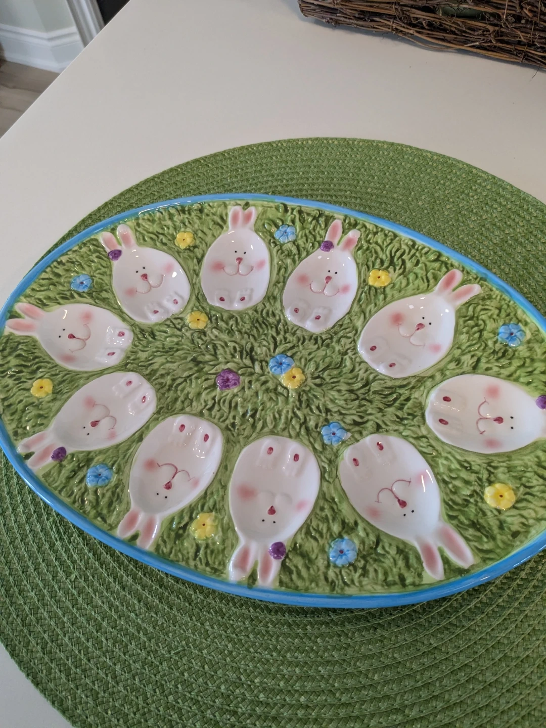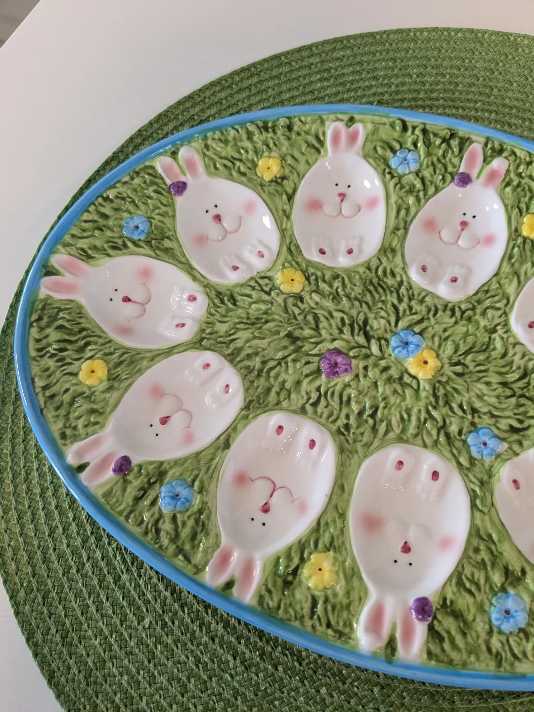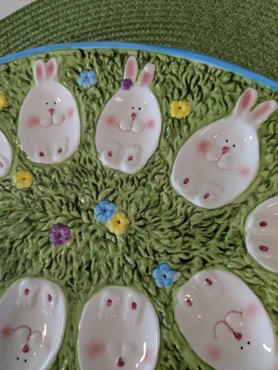 Ceramic oval platter with a grass texture and 10 individual bunny-shaped egg holders. Decorated with small colourful flowers. This plate is perfect for displaying and serving deviled eggs at Easter gatherings!