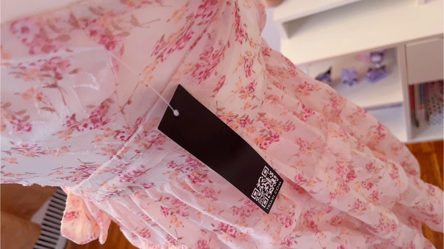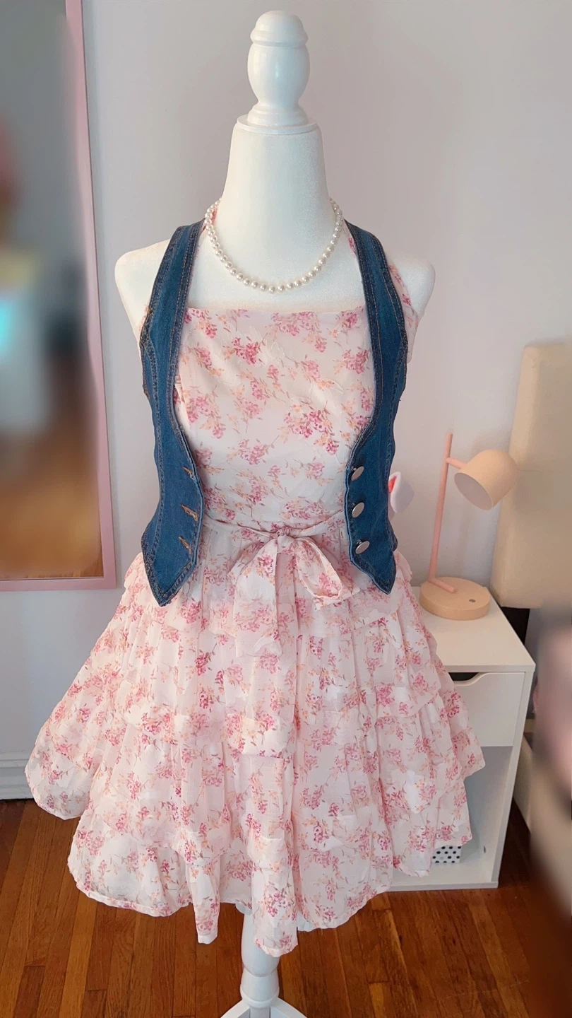 Light pink floral print dress with a halter neck and ruffle skirt. Features a tie waist detail and a sheer overlay. Made with chiffon material.