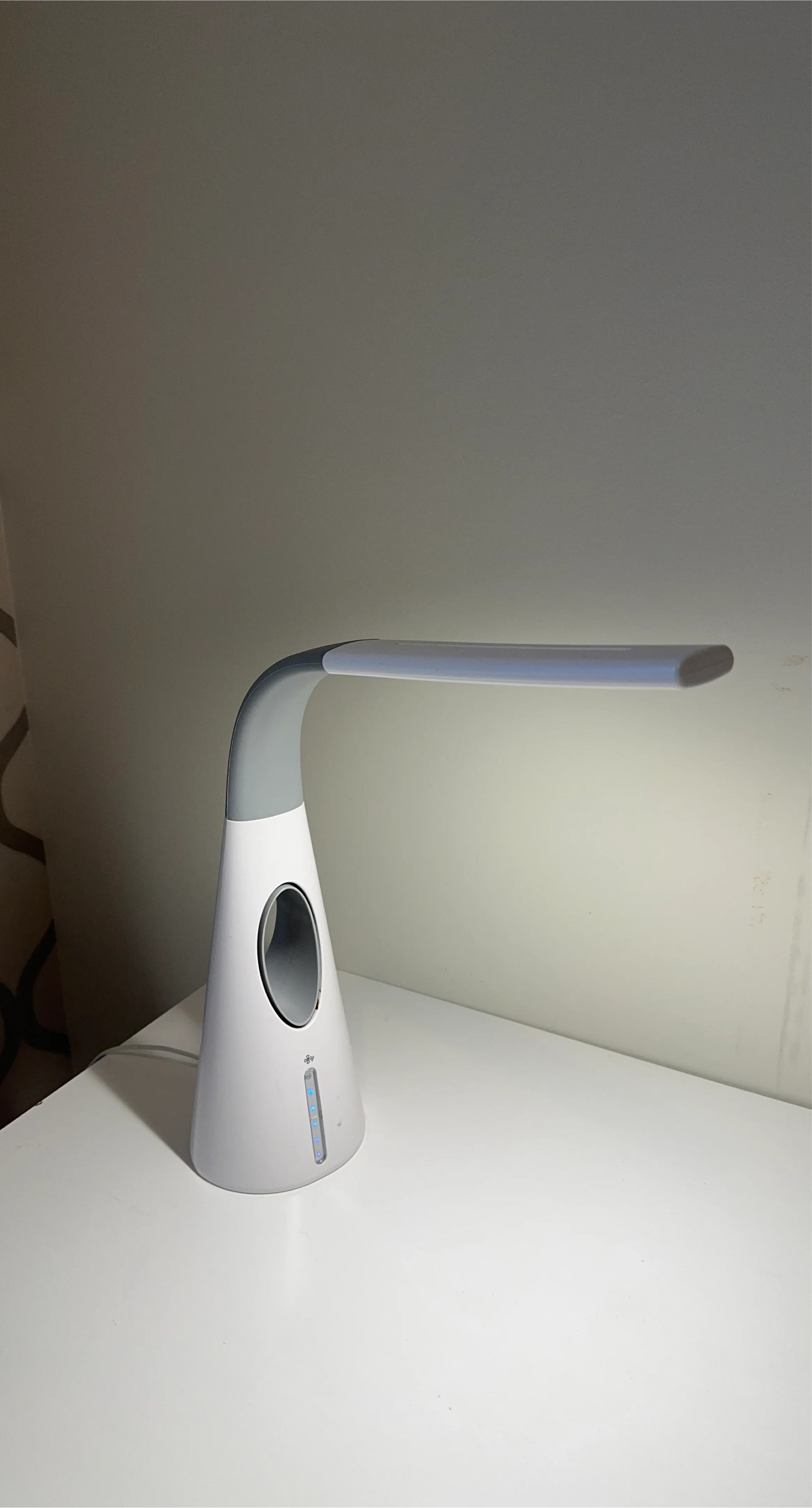 This is a modern LED desk lamp, featuring a sleek white base and a flexible grey arm. It has adjustable brightness levels indicated by blue LED lights on the base. Perfect for study or work spaces needing focused lighting.