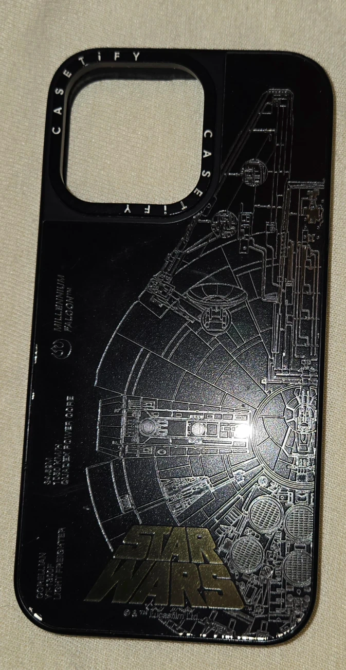 Selling a Casetify iPhone Pro case featuring a Star Wars Millennium Falcon design! It's in great condition and has a sleek black finish