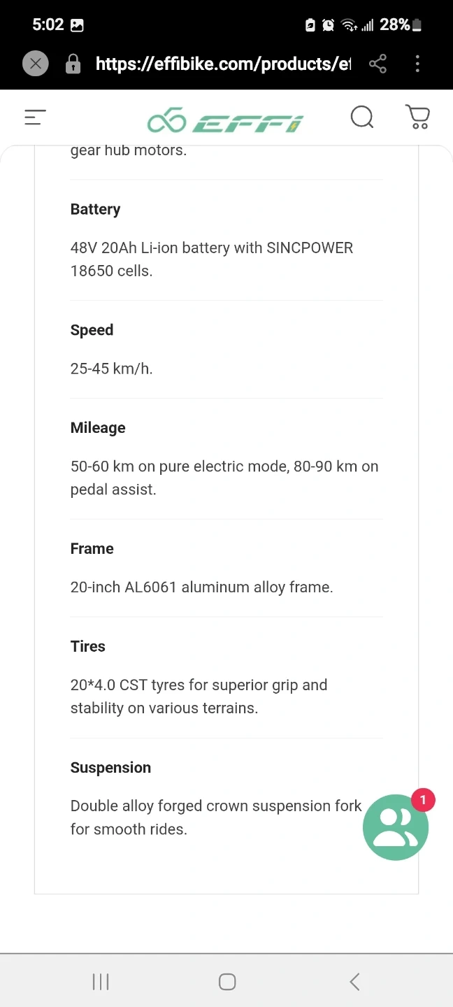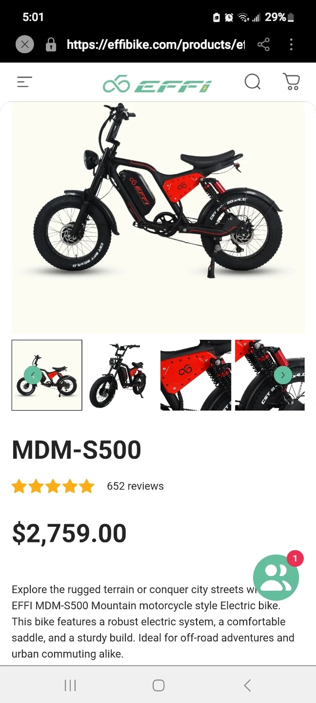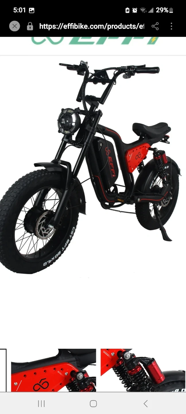 152Selling an Efi MDM-S500 Mountain style electric bike! This bike features a robust electric system, a comfortable saddle, and a sturdy build. It's ideal for off-road adventures and urban commuting alike. Dual motor Key features include: - 48V 20Ah Li-ion battery with SINPOWER 18650 cells - Speed: 25-45 km/h - Mileage: 50-60 km on pure electric mode, 80-90 km on pedal assist - Frame: 20-inch AL6061 aluminum alloy frame - Tires: 20*4.0 CST tyres for superior grip and stability on various terrains - Suspension: Double alloy forged crown suspension fork for smooth rides Originally priced at $2,759.00