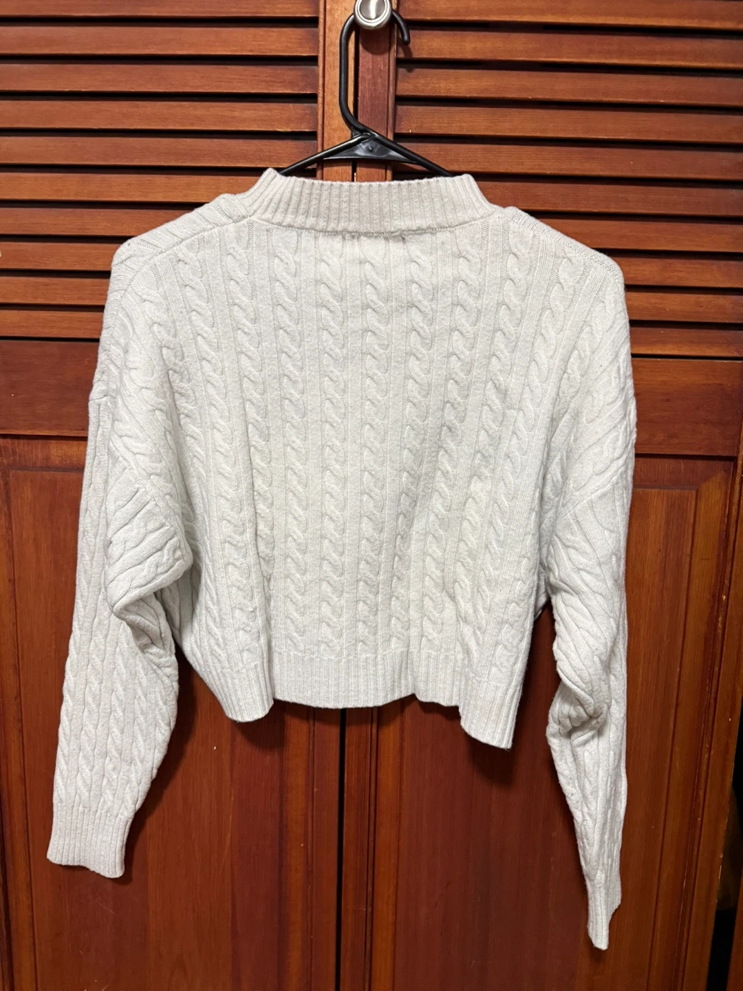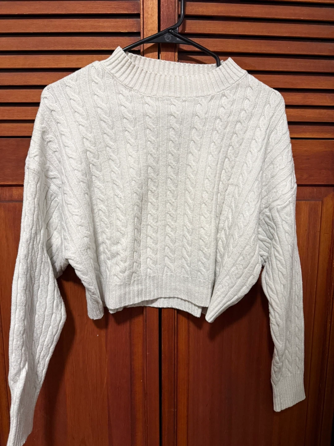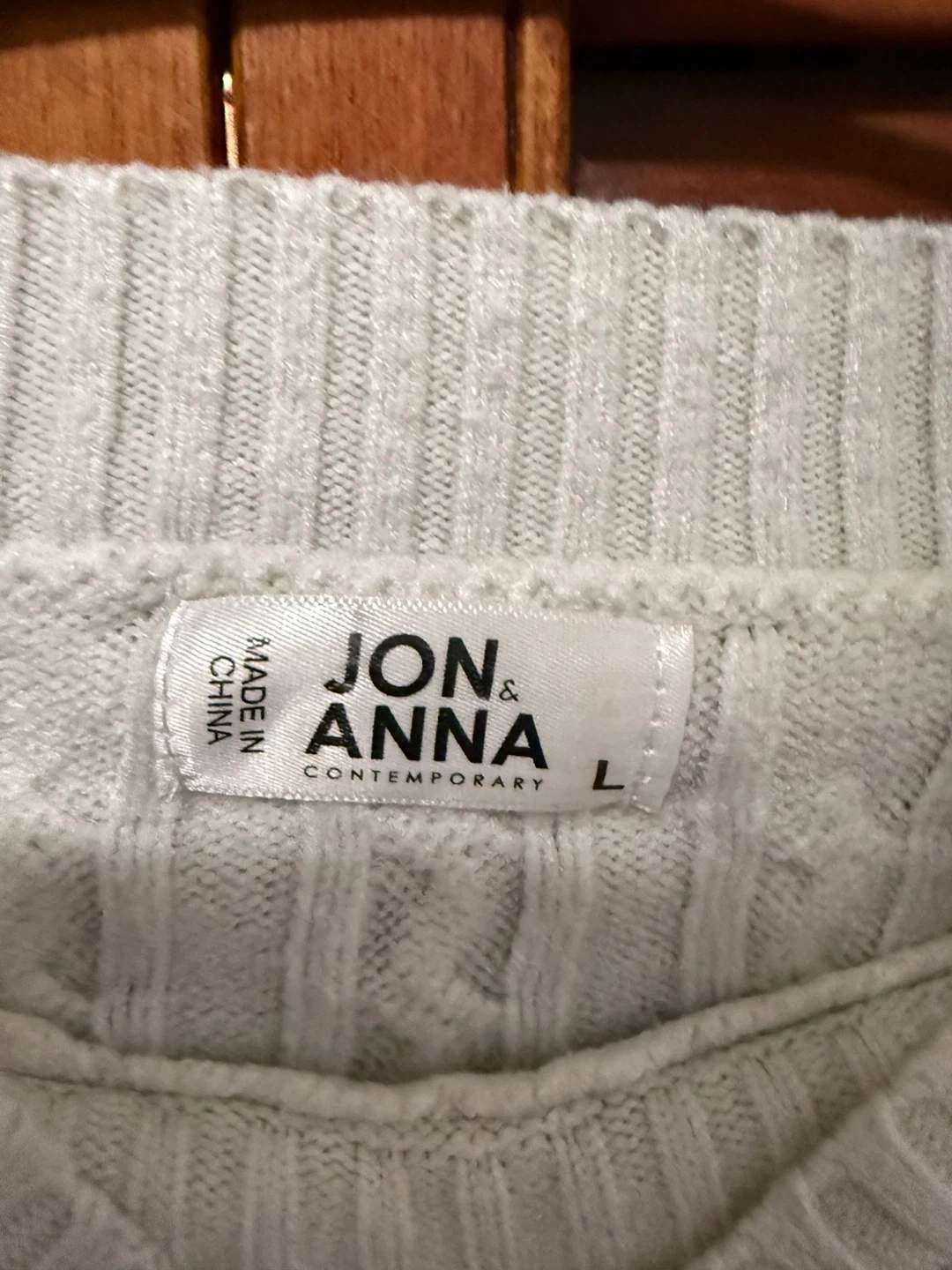 Cozy up in this Jon & Anna Contemporary sweater! It's a lovely neutral colour with a classic cable knit design. Size L.
