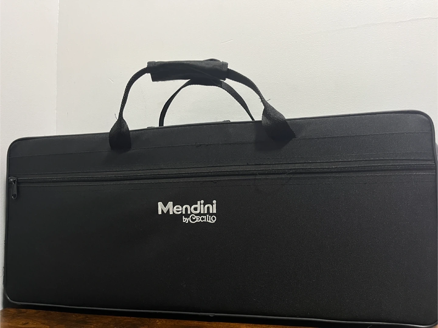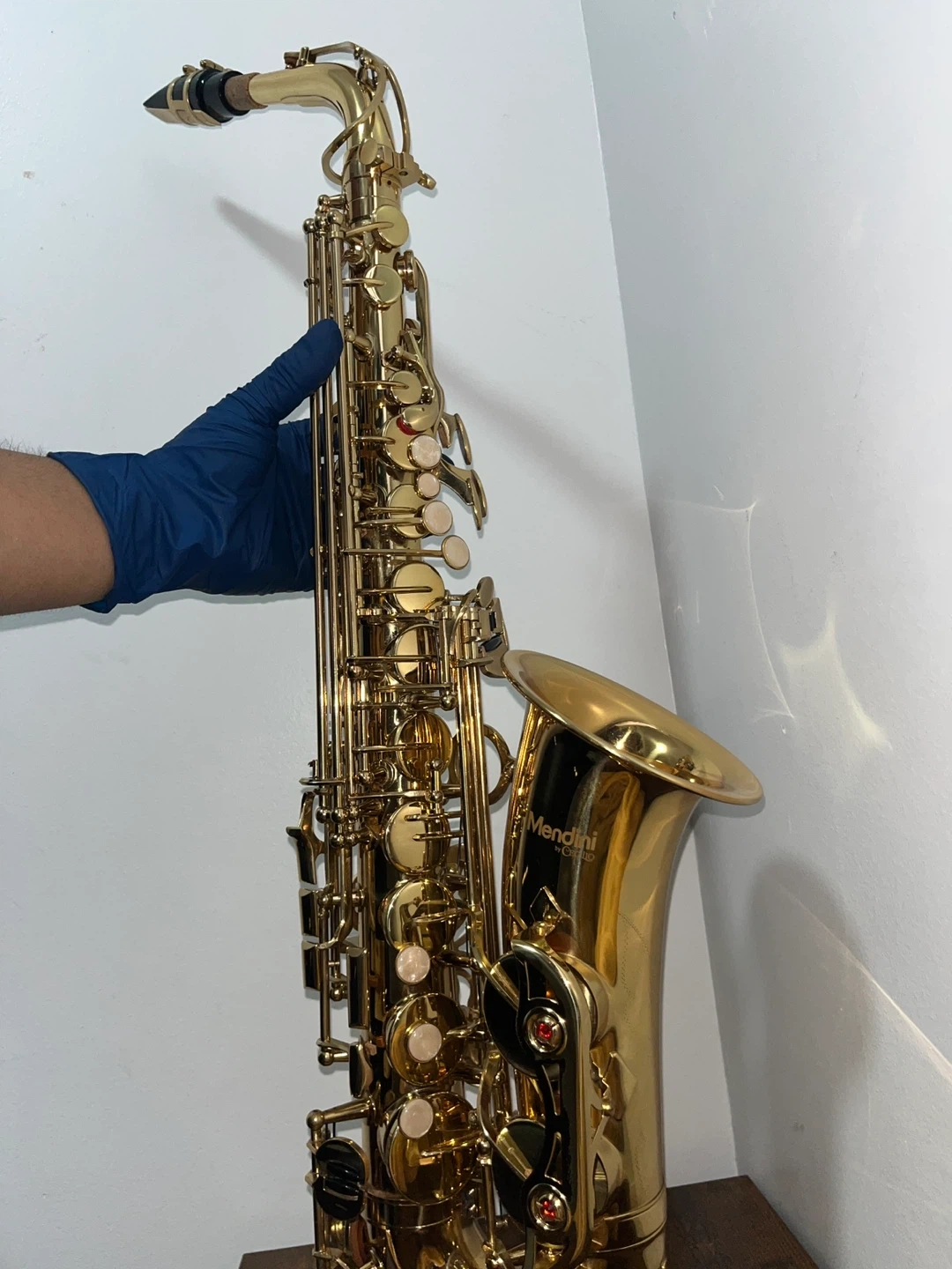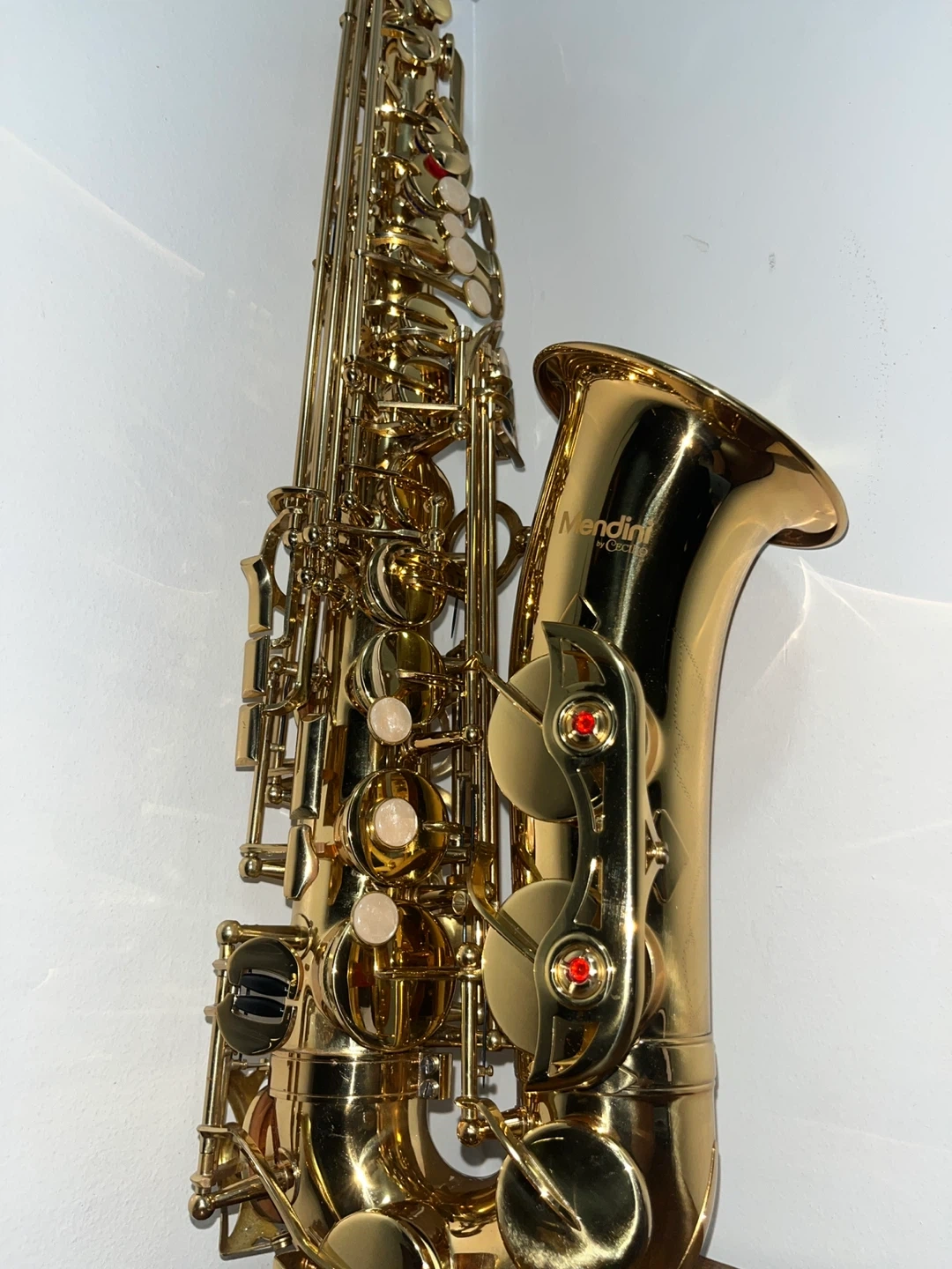 This is a Mendini by Cecilio alto saxophone. It's gold in color and includes a case, reeds, and cleaning supplies. This instrument is great for beginners or intermediate players looking for a reliable saxophone.