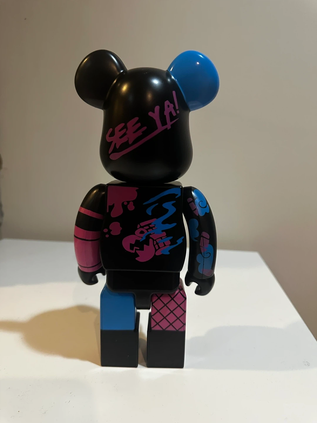 This is a BE@RBRICK figure with a "SEE YA!" design. It features a black base with vibrant pink and blue accents. The figure is 400% size. Perfect for collectors!