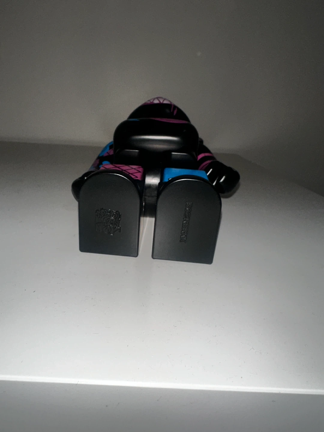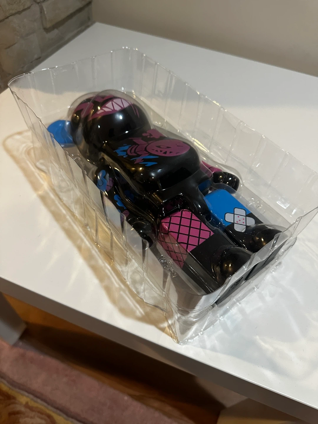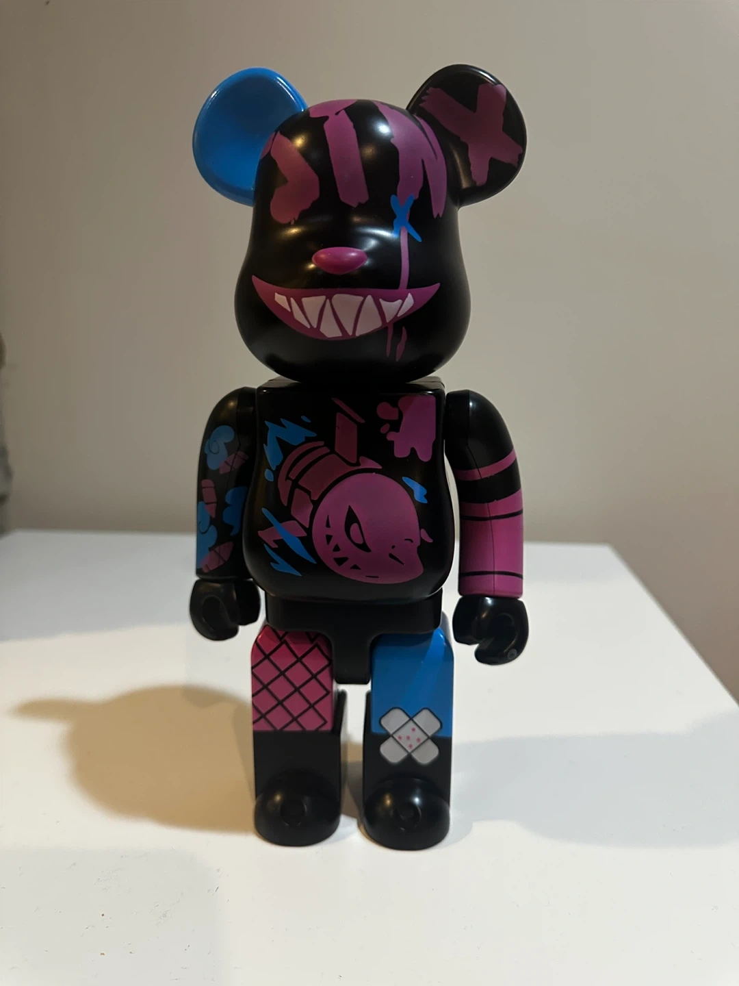 This is a BE@RBRICK figure with a "SEE YA!" design. It features a black base with vibrant pink and blue accents. The figure is 400% size. Perfect for collectors!