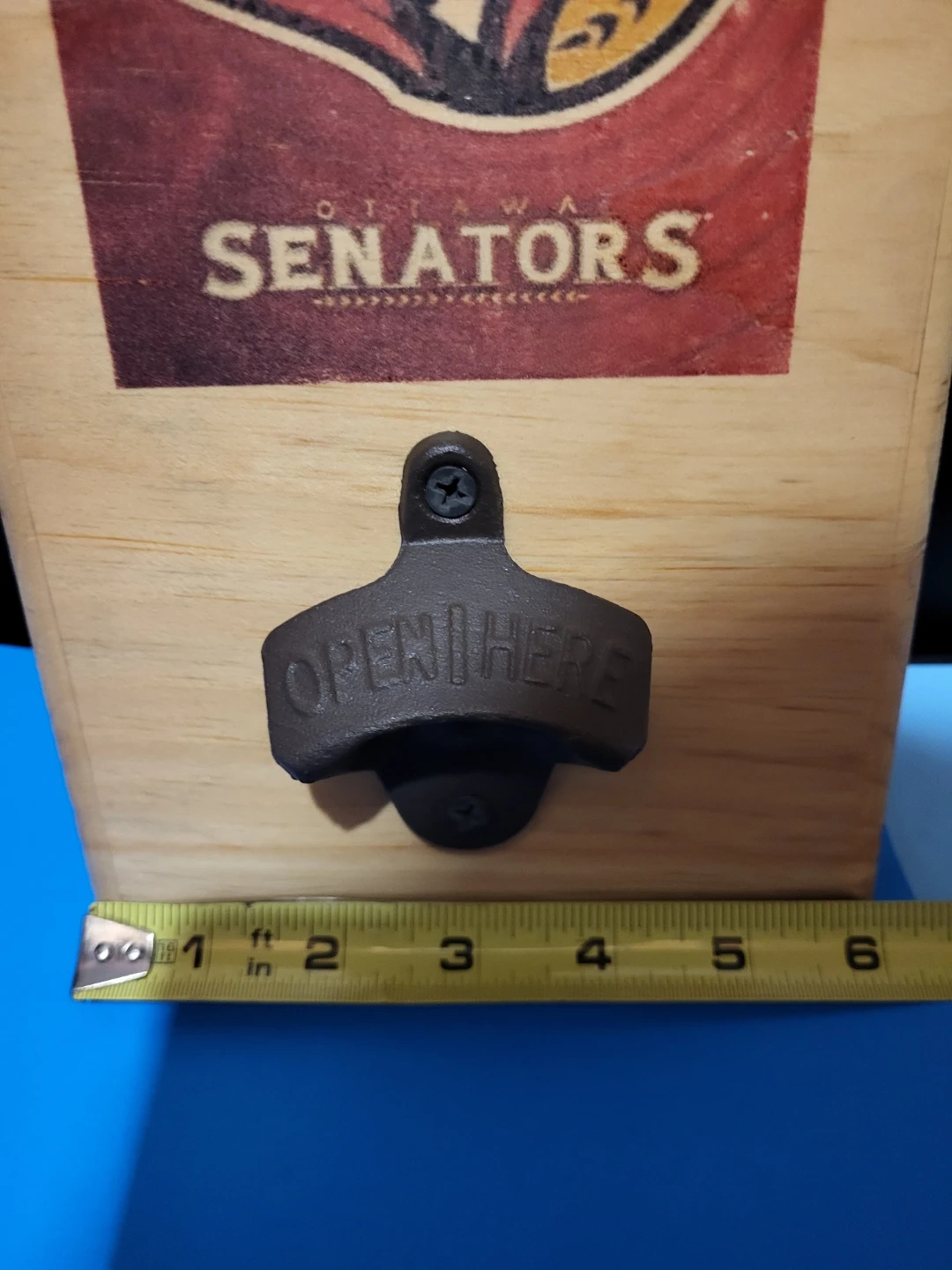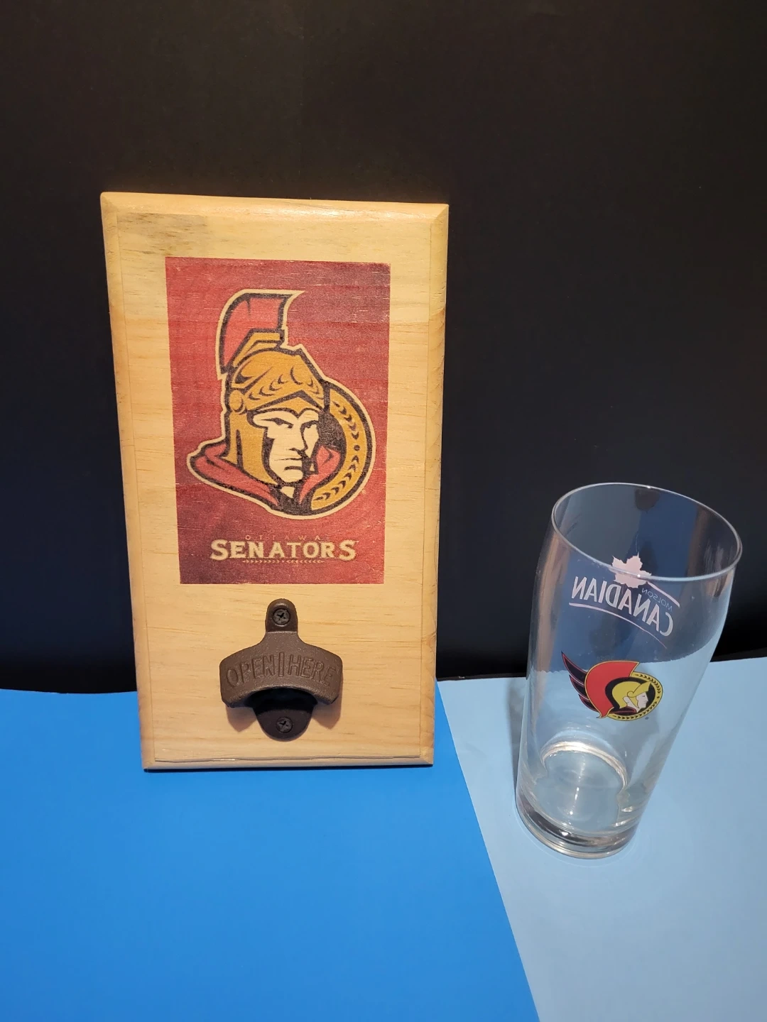 This set features an Ottawa Senators wall-mount bottle opener with a rustic wood finish. It also includes a pint glass with the team logo and Canadian maple leaf. Perfect for any hockey fan's home bar or kitchen!