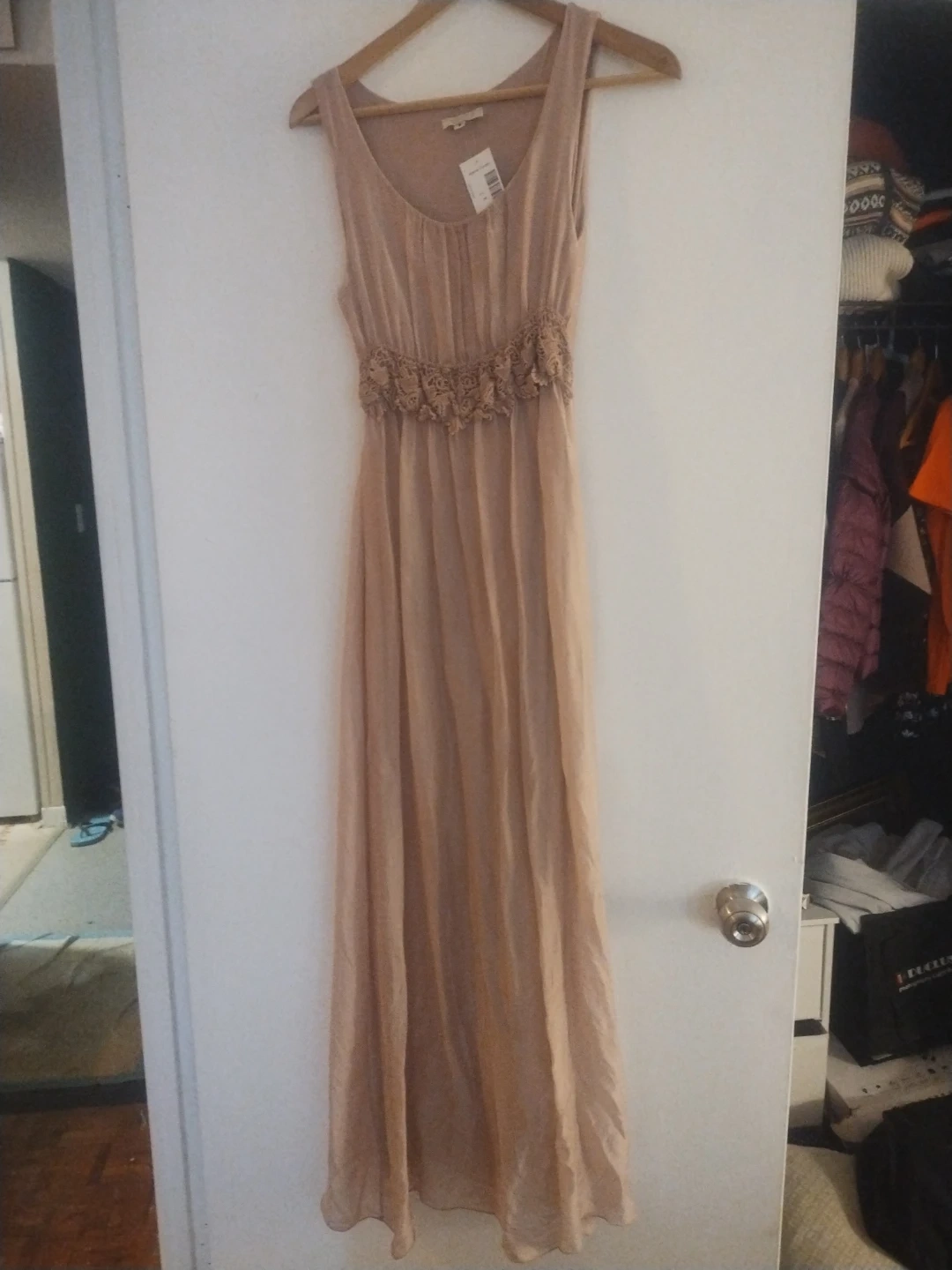 This is a pink sleeveless maxi dress by Keysha. It's a size small and made in Italy. The dress features a cinched waist with decorative lace detailing.