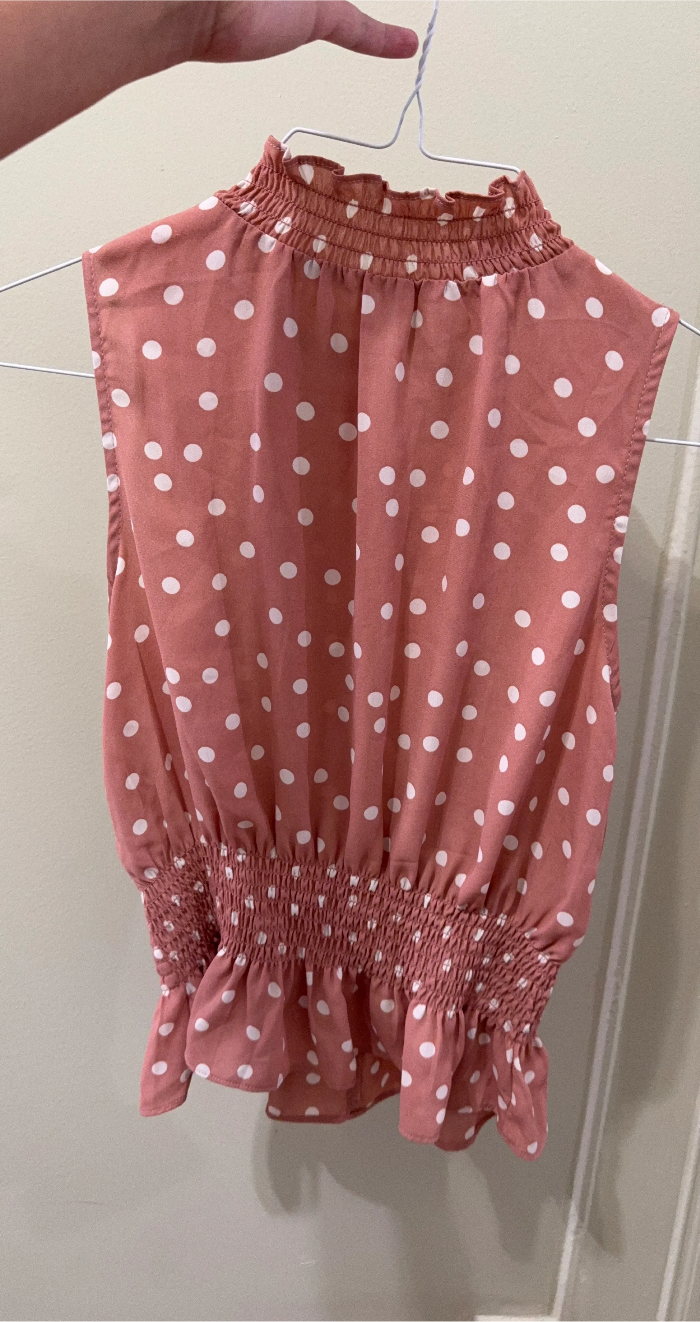 A cute pink sleeveless top with white polka dots! It has a smocked high neckline and a smocked waist. The material is lightweight and perfect for summer