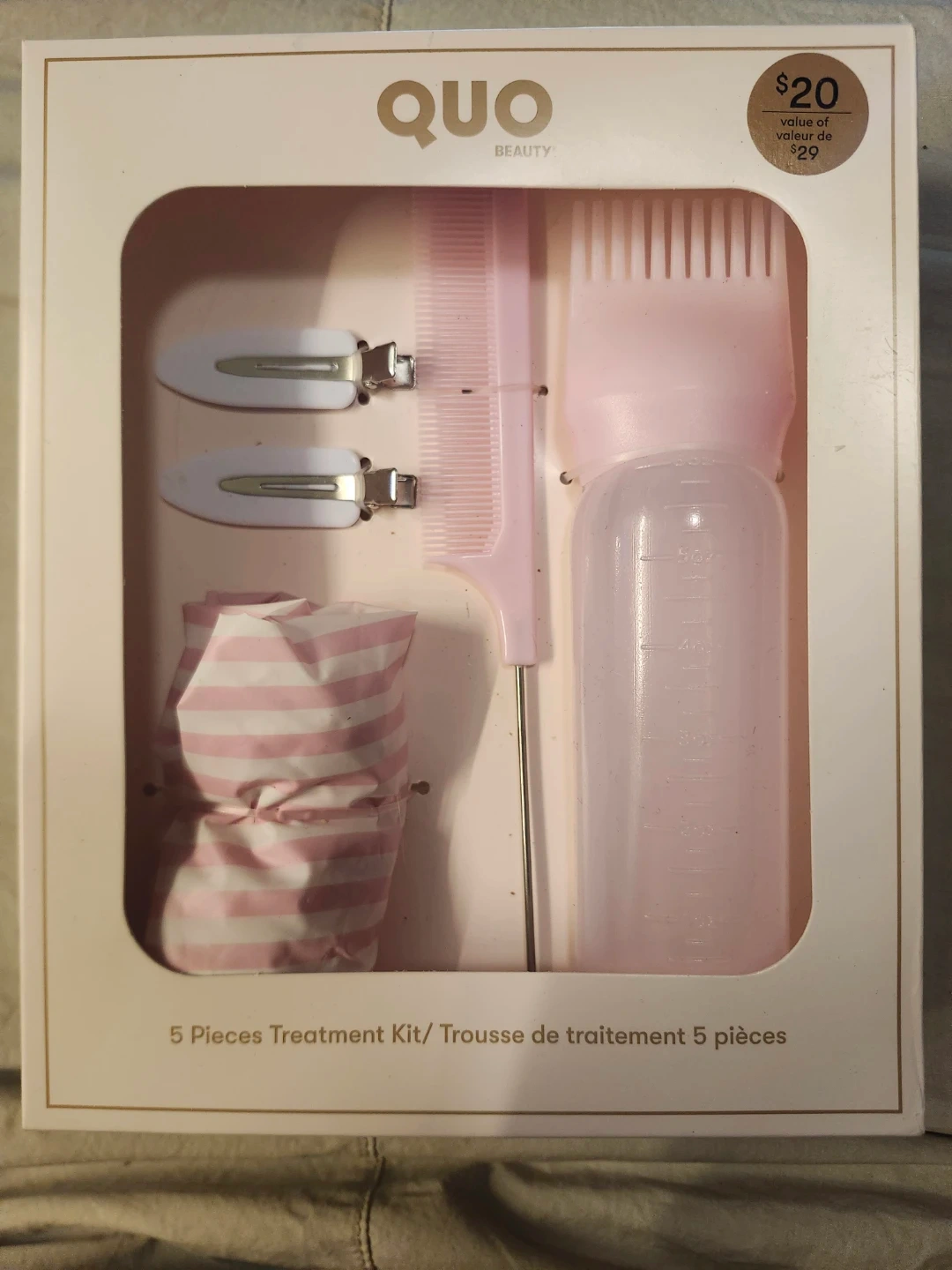 This is a QUO Beauty 5 piece treatment kit. It includes a treatment bottle, comb, applicator brush, and two clips. Perfect for hair treatments at home!