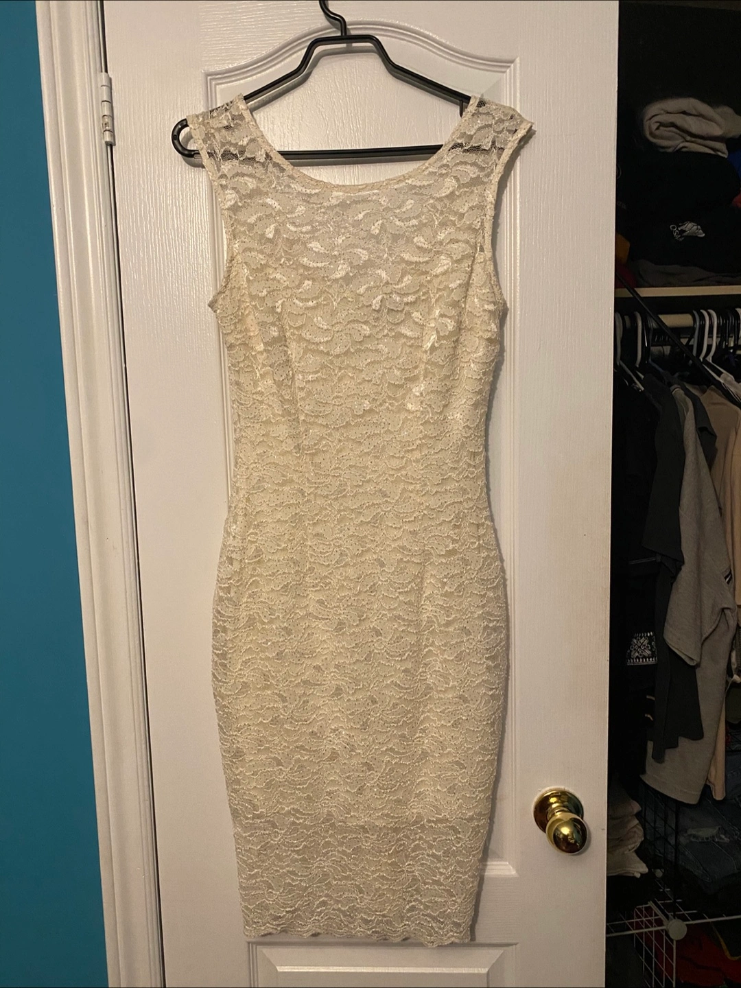 Selling a cream-coloured lace dress. It's in great condition and would be perfect for a special occasion like graduation!