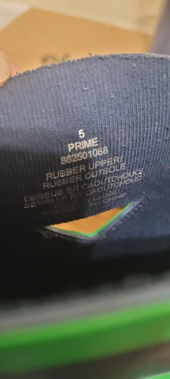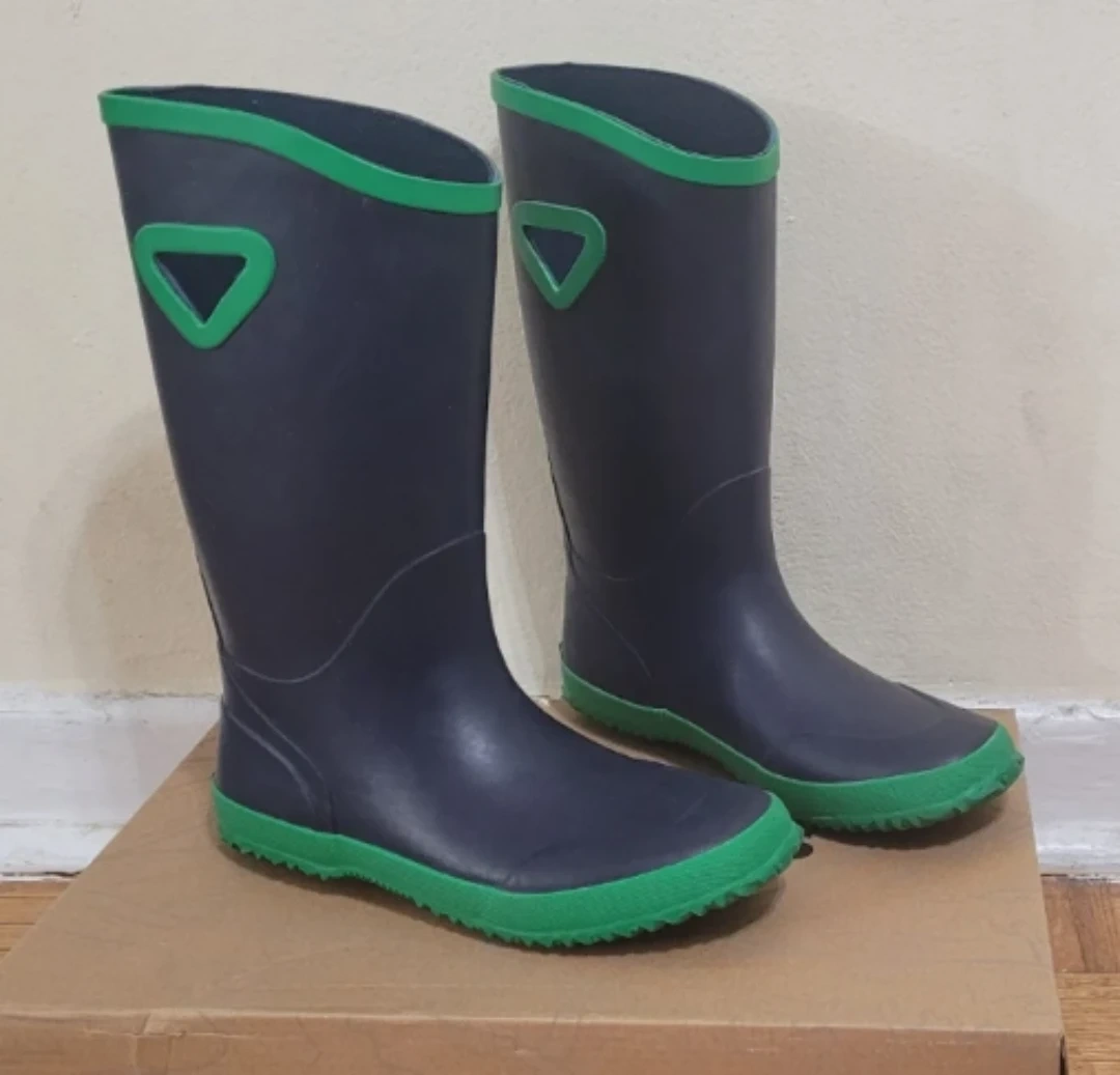 Navy blue rain boots with green trim and soles. Rubber upper and outsole. Size 5. Unisex. Original Box. Price negotiable.