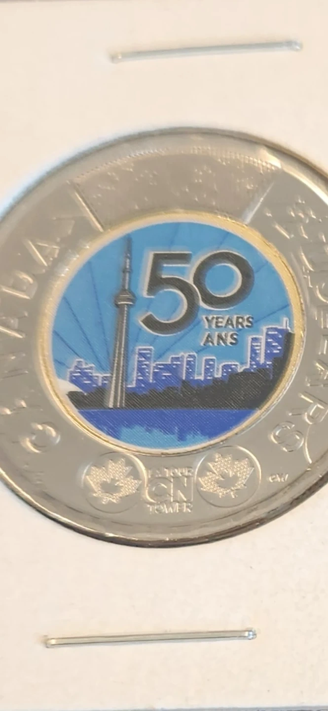 Commemorative coin celebrating 50 years of the CN Tower. 2 dollar value. Coin is silver-toned with coloured accents depicting the Toronto skyline and CN Tower.